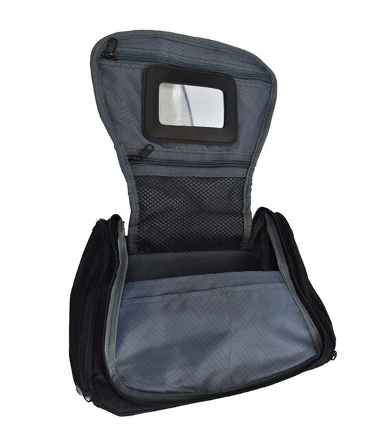 Модель має основне відділення на блискавці, передню кишеню, дві бокові кишені, а також додаткові внутрішні відділення — дві на блискавці (одна з сіткою), чотири відкриті кишені та чотири еластичних петлі для кріплення флаконів і тюбиків. Усередині передбачено гнучке дзеркальце на застібці Velcro, а водостійке дно захищає від протікання та полегшує догляд за косметичкою. Для зручності є ручка для перенесення, а в одній з кишень знаходиться гачок для підвішування в розкритому положенні.