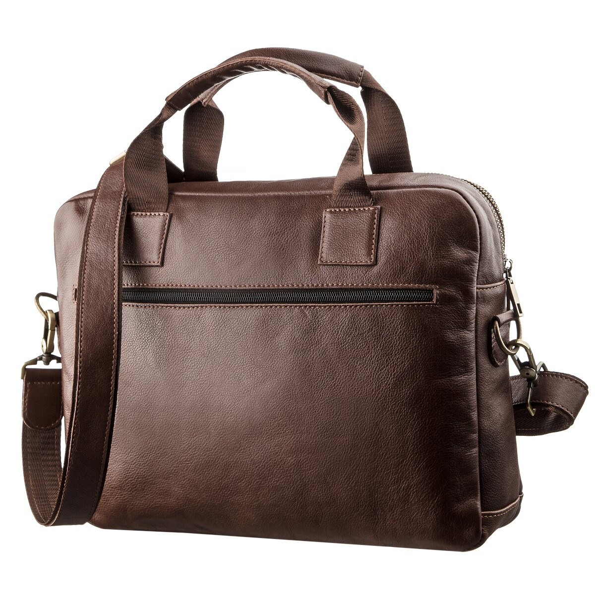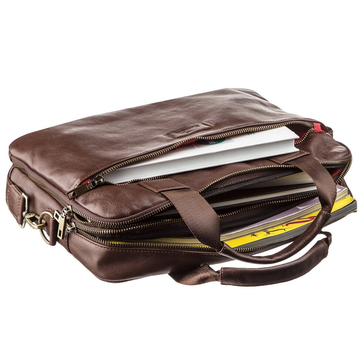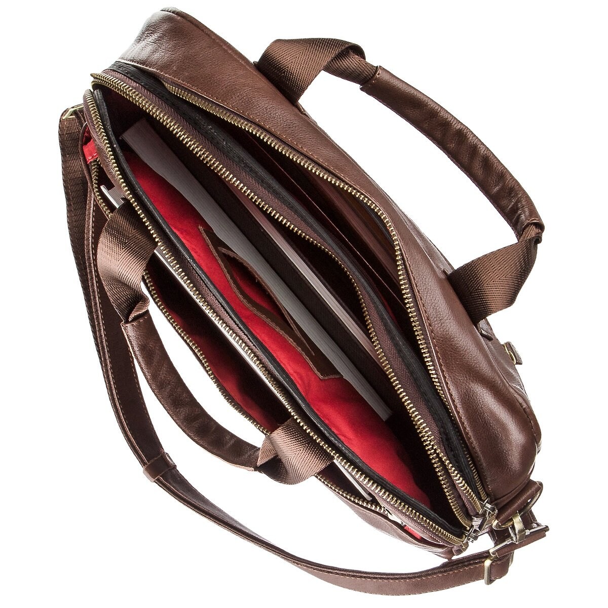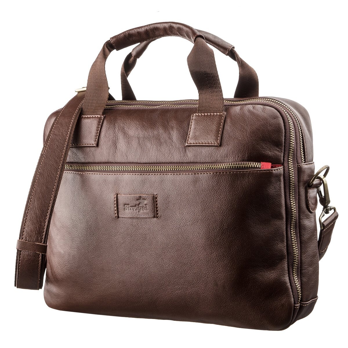 Шкіряна сумка для ноутбука. Ви можете носити модель декількома способами в руках або на плечі за допомогою знімної текстильної ручки зі шкіряною вставкою. Варто відзначити, що всередині виробу оригінальна червона підкладка, яка не залишиться непоміченою. На лицьовій стороні аксесуара тиснений логотип бренду з рівним рядком. В сумку поміститься ноутбук з діагоналлю 14 дюймів. Сумка має два відділення, що дуже зручно для зустрічей або поїздок. Ви можете носити як ноутбук, так і необхідні документи. Виріб оцінять ділові чоловіки, які цінують якість і комфорт.