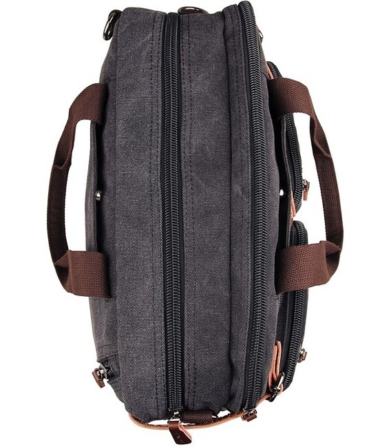 Містка чоловіча сумка-трансформер з міцної тканини. Виріб складається з двох великих відділень, які закриваються на надійні товсті блискавки. У першому відділенні знаходиться відділення з м'якою перегородкою для 15-дюймового ноутбука, а також потайна кишенька на змійці. У другому відділенні дві невеликі кишені під гаманець і телефон.