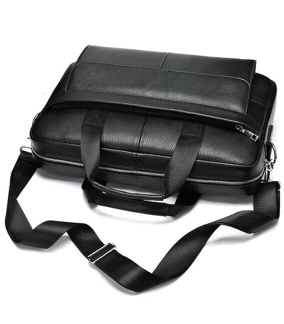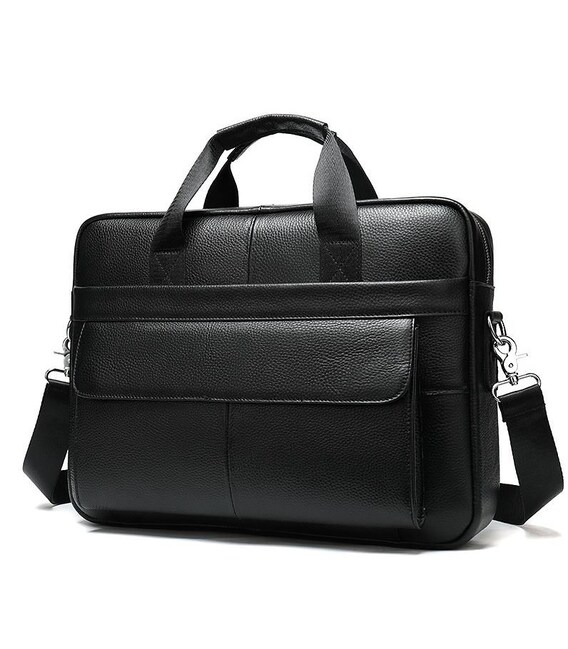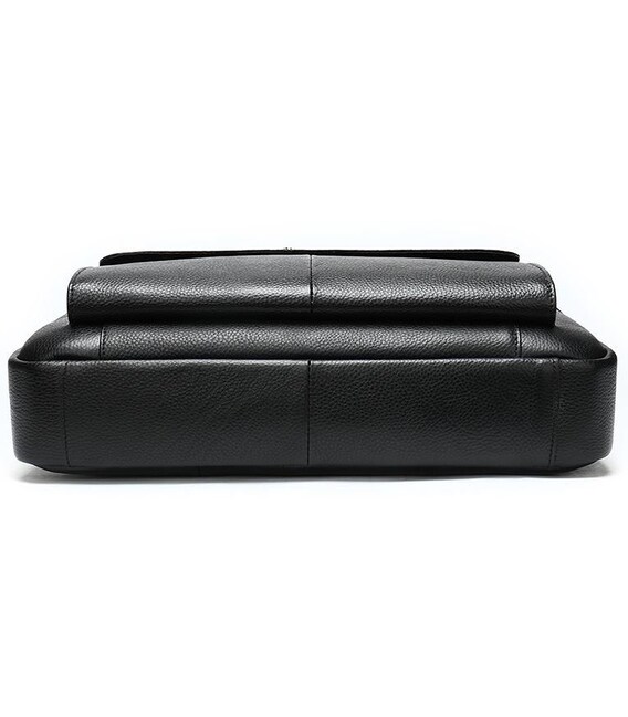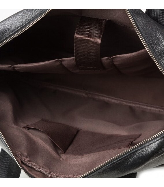 Вмістка чоловіча сумка з відділенням для невеликого ноутбука 15 дюймів, а також документів формату А4. Аксесуар виконаний з натуральної зернистої шкіри чорного кольору. На лицевій стороні даного виробу розташовані два вмістких відділення, одне під клапаном на магнітах, інше на блискавці. На задній зовнішній стороні знаходиться ще одне відділення на блискавці. Сумку можна переносити в руці за допомогою зручних шкіряно-текстильних ручок, а також через плече (в комплекті є регульований плечовий ремінь, який виконаний з текстильного матеріалу). Колір фурнітури: срібло.