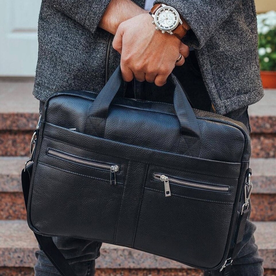 Стильна сумка для ноутбука в чорному кольорі. Зроблена з натуральної шкіри із зернистою текстурою.