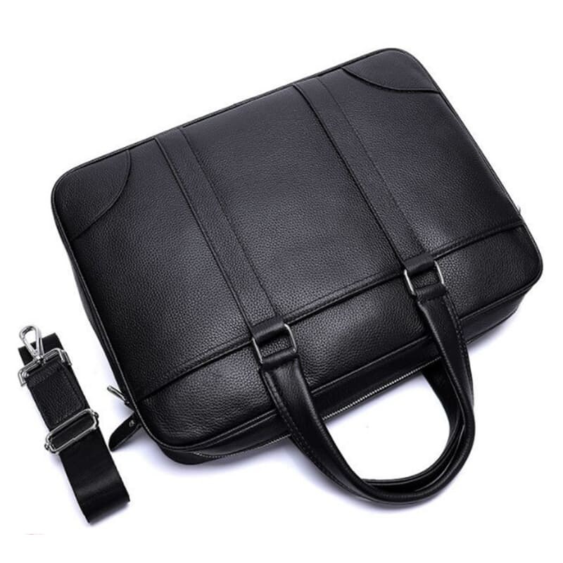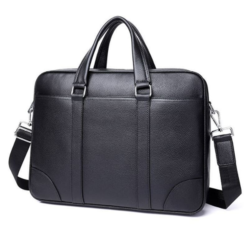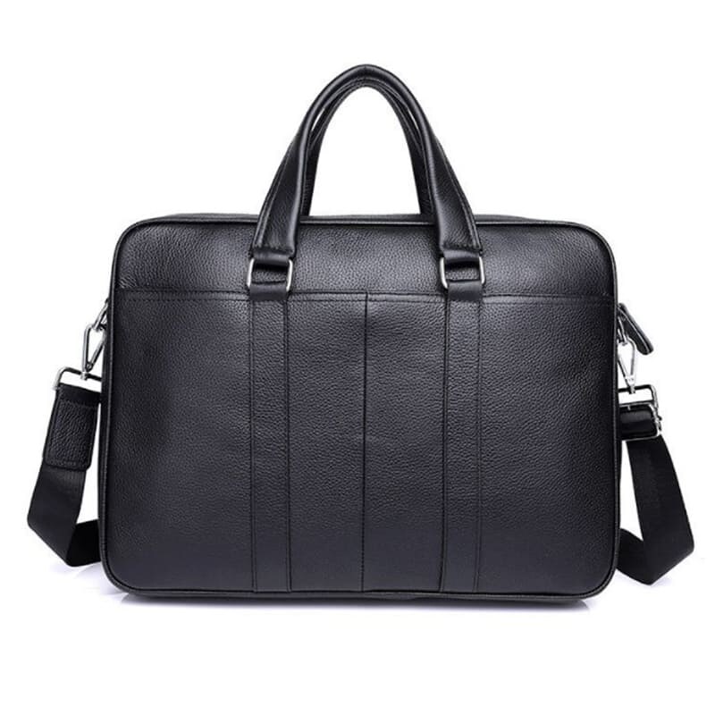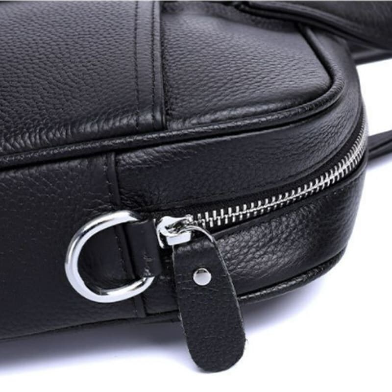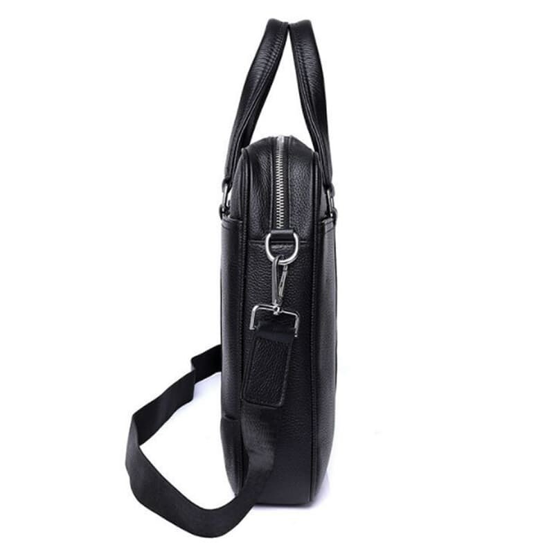 Сумка з натуральної шкіри чорного кольору - відмінний варіант для ділових чоловіків. Це ідеальний варіант для роботи і для ділових поїздок. Має 1 відділення, яке закривається на блискавку. Всередині сумки - 1 кишеня на блискавці і відділ під планшет або ноутбук. З тильного і лицьового боку сумки місткі накладні кишені на кнопках. Підкладка-текстиль. Колір фурнітури срібло. В комплекті-знімний плечовий ремінь.