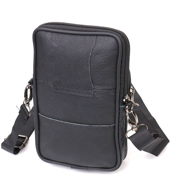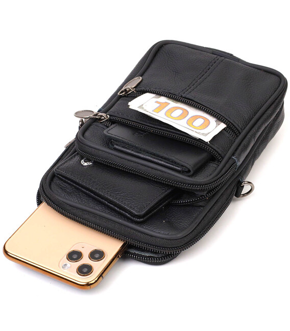 Маленька вертикальна сумка на пояс із натуральної м'якої шкіри. Аксесуар Ви зможете носити на поясі за петельку або на плечі за допомогою знімного текстильного ремінця. Виріб складається з основного відділення та трьох кишень різної величини. Аксесуар стане просто знахідкою у подорожах чи для водіїв.