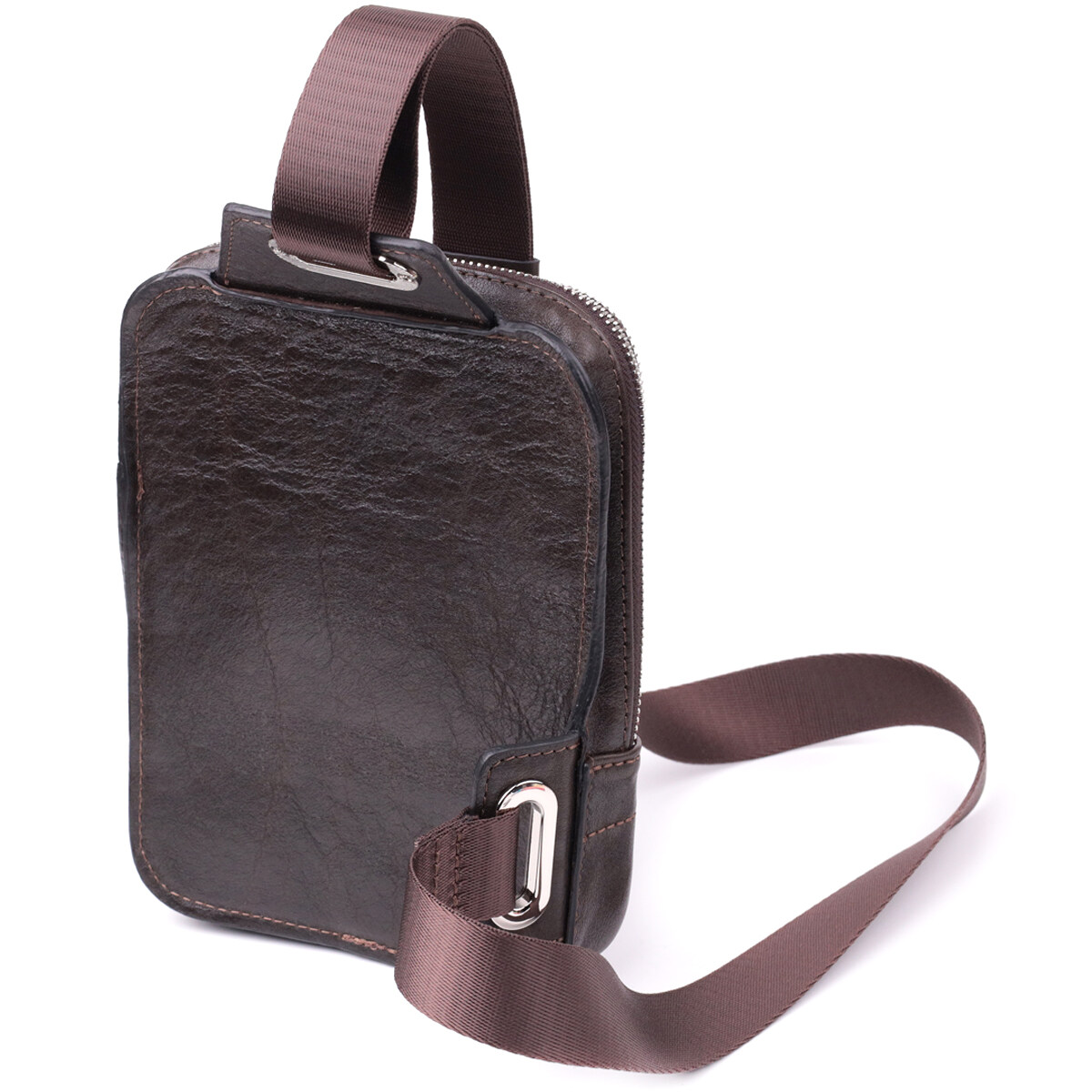 Стильна чоловіча сумка з якісної натуральної шкіри, яка має благородний блиск і приємна на дотик. Носити таку сумку зручно через плече, це дуже зручно у подорожах, коли всі найцінніші речі мають бути під рукою. Сумка доповнена якісною фурнітурою срібного кольору, шви рівні та акуратні. Аксесуар дуже універсальний і стильний для сучасних чоловіків, що підходить як для ділового, так і для повсякденного образу. Ця сумка-бананка, ідеальне поєднання практичності та витонченого стилю, що підкреслює ваш смак та увагу до деталей.