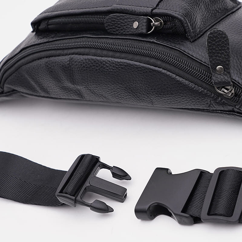 Чоловіча шкіряна сумка на поясі. Має 1 відділення на блискавці, всередині одна кишеня. Зовні -2 кишені. Підкладка - текстиль, незнімний плечовий ремінь.