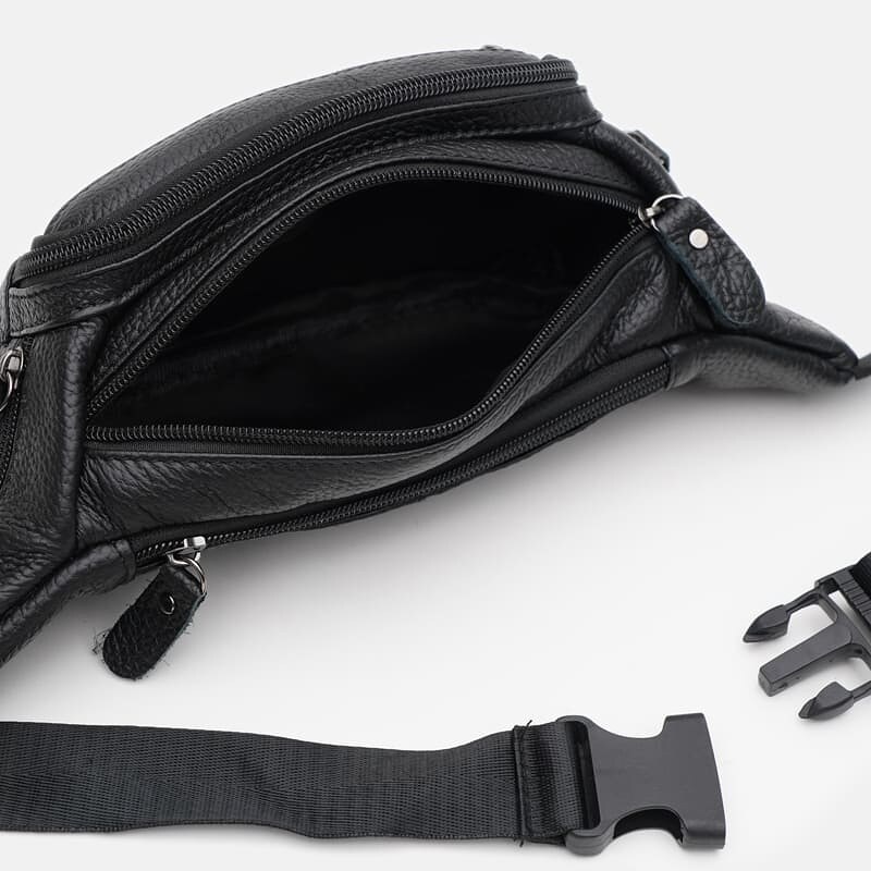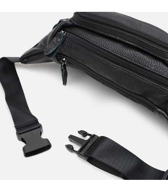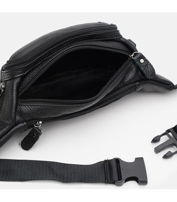 Сумка на пояс виготовлена з натуральної шкіри. Має 1 відділення на блискавці. Зовні 4 кишені на блискавці та 2 бічні кишеньки для дрібниць. Підкладка-текстиль. Поясний ремінь регулюється по довжині.