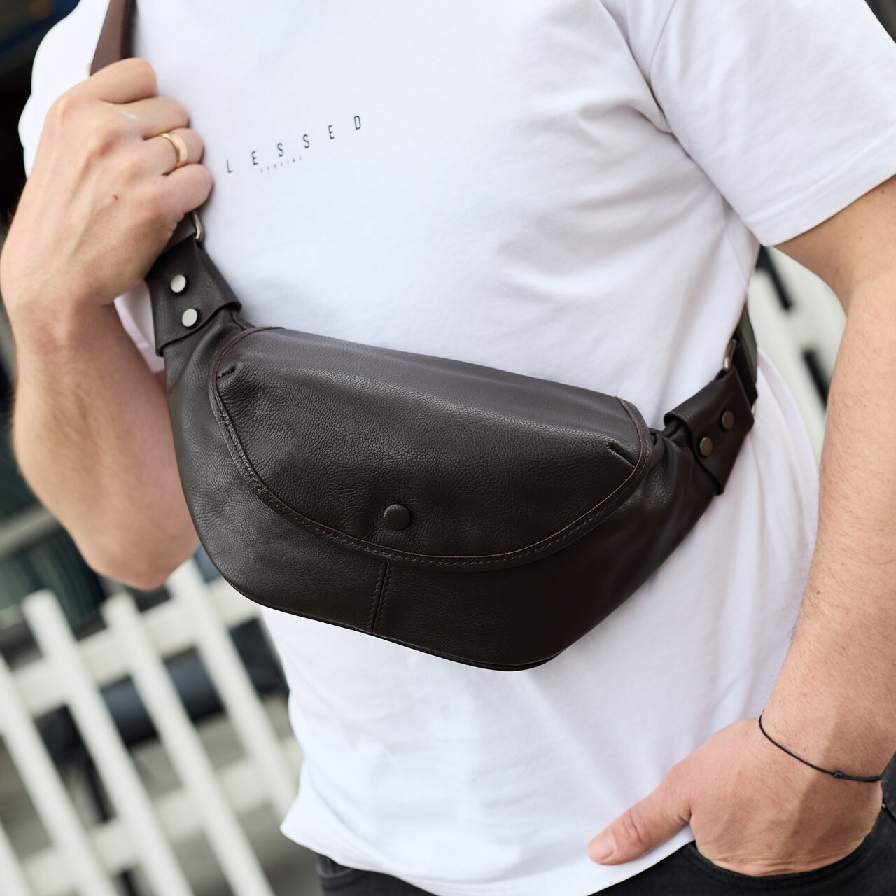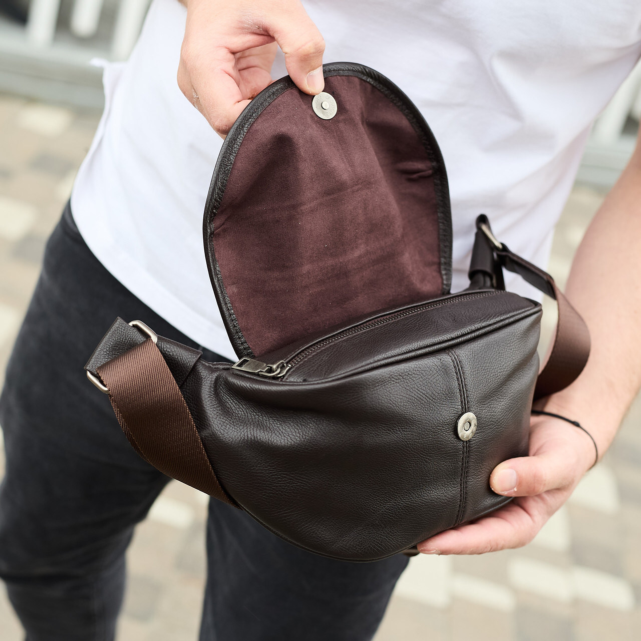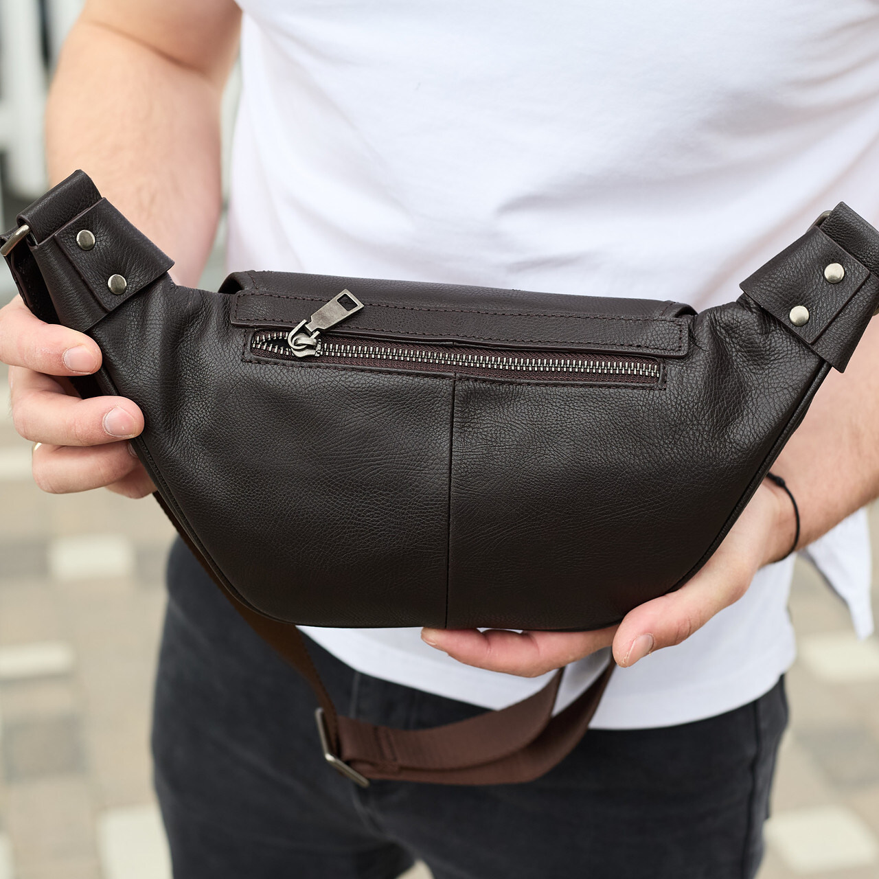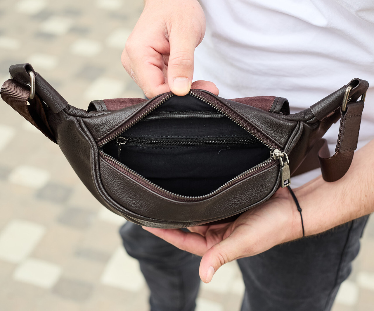 Лаконічна чоловіча бананка із натуральної шкіри чорного кольору з фурнітурою під стару бронзу. Бананка зручно розміщується на тілі та дозволяє непомітно носити всі необхідні речі при собі. Бананка має одне велике відділення на блискавці, усередині якого є бокова кишеня, а також додаткову кишеню на блискавці, позаду. Ремінець бананка регульований, не знімний, має надійне кріплення.