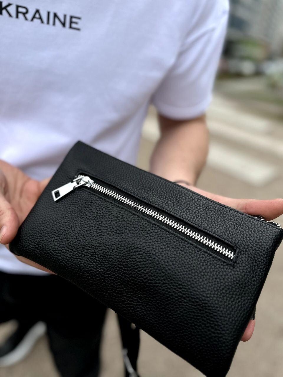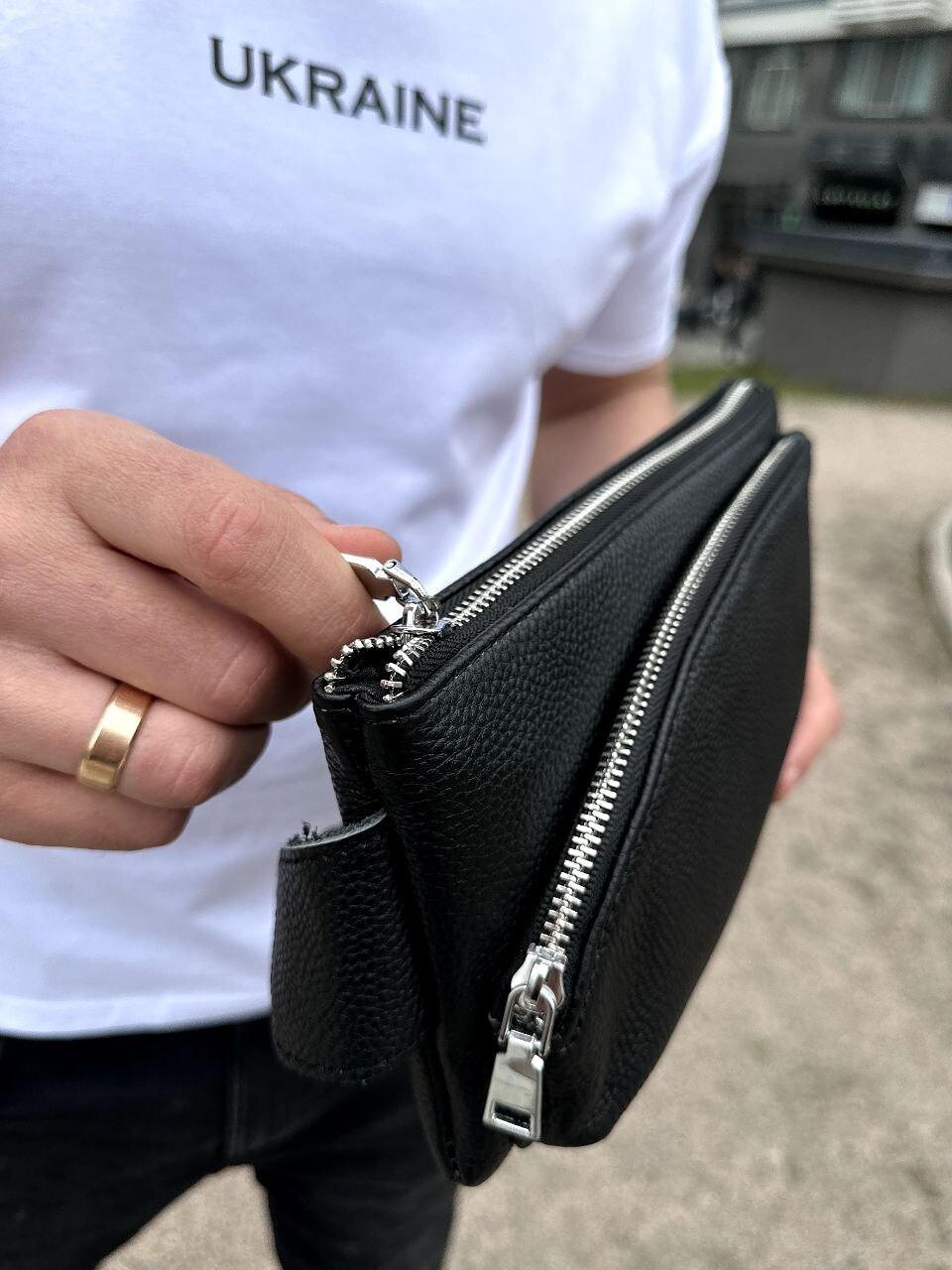 Лаконічна чоловіча бананка із натуральної шкіри чорного кольору з фурнітурою під срібло. Бананка зручно розміщується на тілі та дозволяє непомітно носити всі необхідні речі при собі. Бананка має одне велике відділення на блискавці, усередині якого є бокова кишеня, а також одне додаткове відділення на блискавці (з передньої частини бананка ). Ремінець бананка регульований, не знімний, має надійне кріплення.