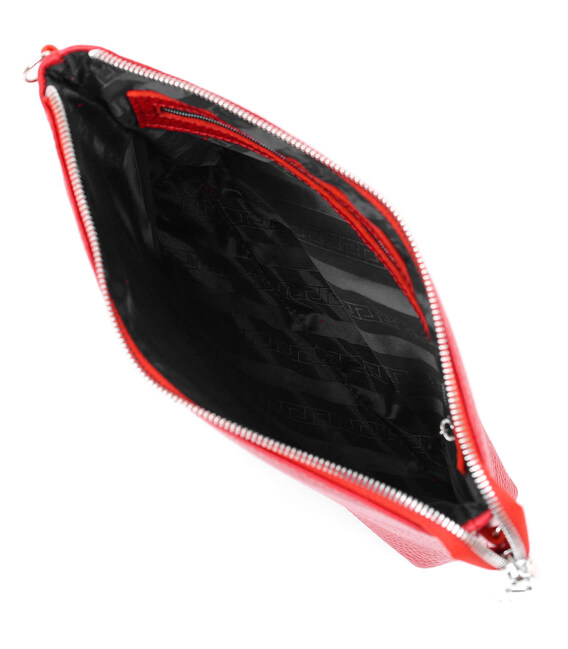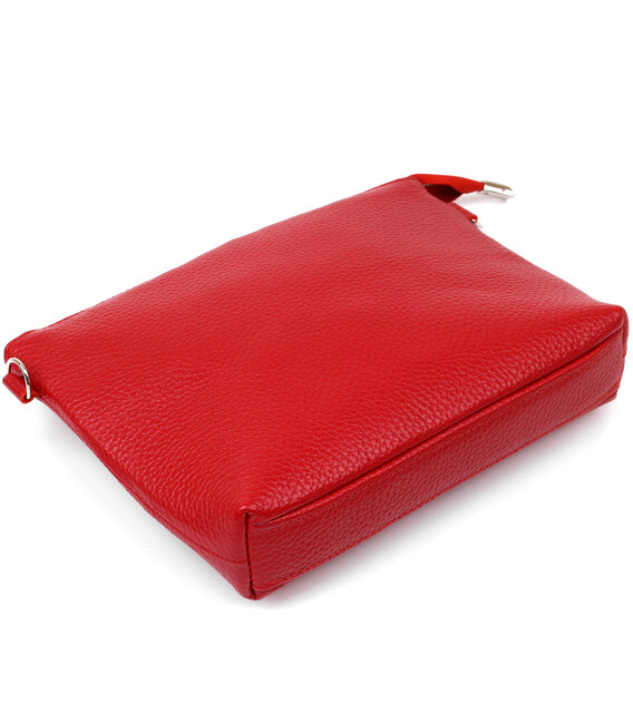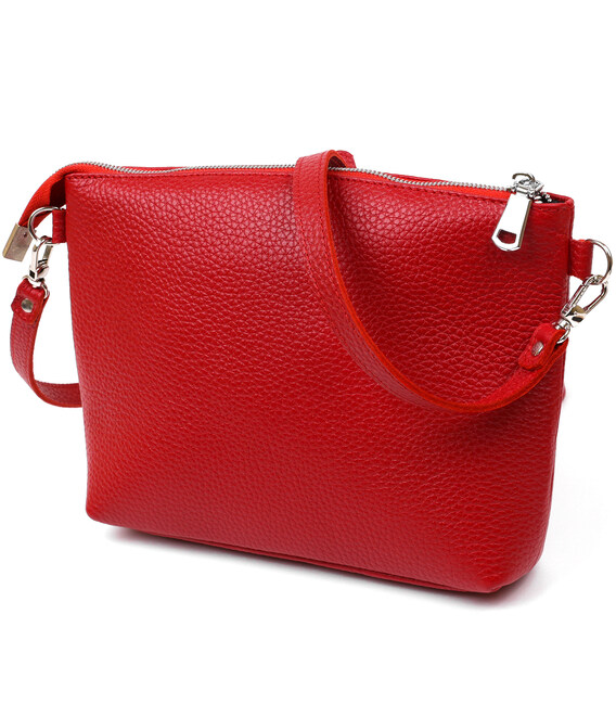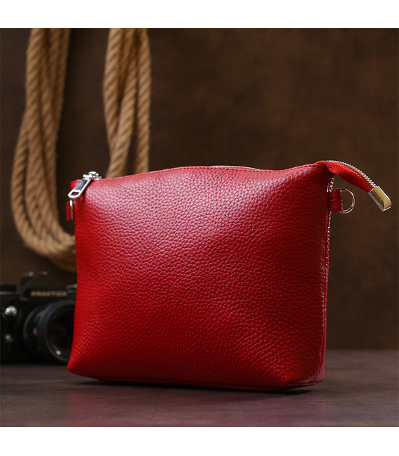 Яскрава шкіряна сумка із висококласної натуральної шкіри з покращеними характеристиками зносостійкості. Має одне містке відділення та кишеню для цінних речей на блискавці. Колір цієї моделі – насичений червоний, фактура – зерниста. Ремінь виконаний із натуральної шкіри та регулюється по довжині. Фурнітура зроблена під срібло.