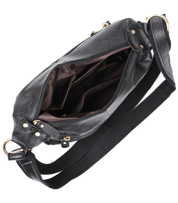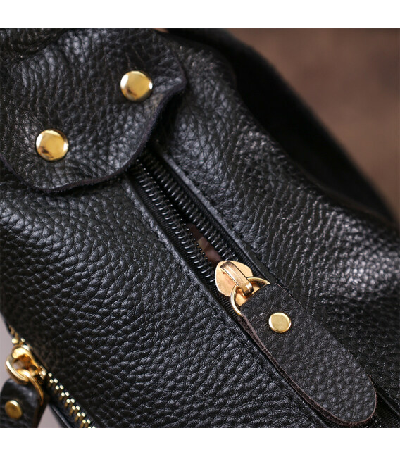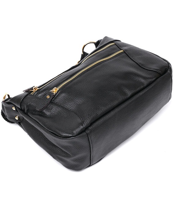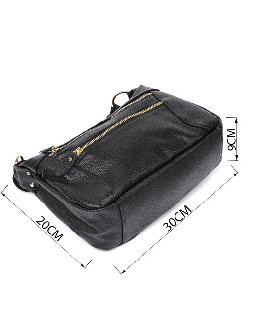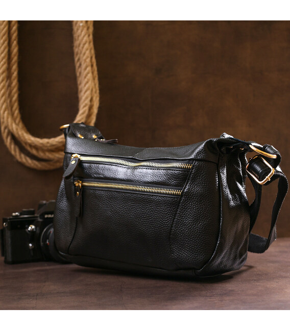 Практична жіноча сумка невеликого розміру із натуральної високоякісної шкіри із зернистою фактурою. Має універсальний чорний колір та фурнітуру під золото. Внутрішнє наповнення представлене у вигляді місткого відділення на блискавці, кишень для телефону та інших дрібних речей. На зовнішній стороні також є місткі кишені.
