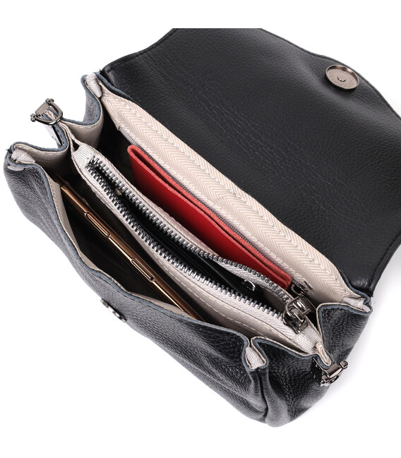 Компактна жіноча сумка з м'якої добротної шкіри, яка чудово носиться і не втрачає свого первісного вигляду. Аксесуар складається з одного основного відділення в якому всередині дві кишені на блискавках. Носити сумку можна в руках, на плечі і через плече, для цього є шкіряний ремінь, що знімається. У виробі використано якісну фурнітуру кольору темного срібла. Універсальний варіант сумки як на вечір так і як сумочка на кожен день.