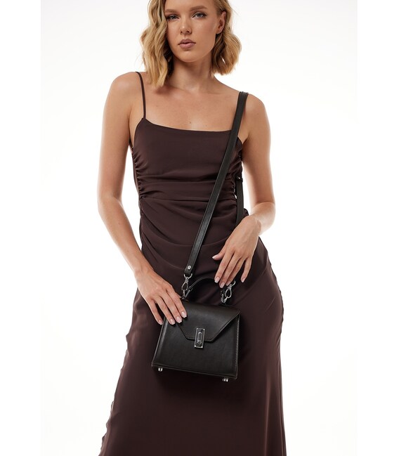 Сумка оснащена короткою ручкою та довгим ремінцем.