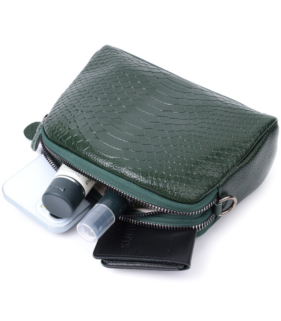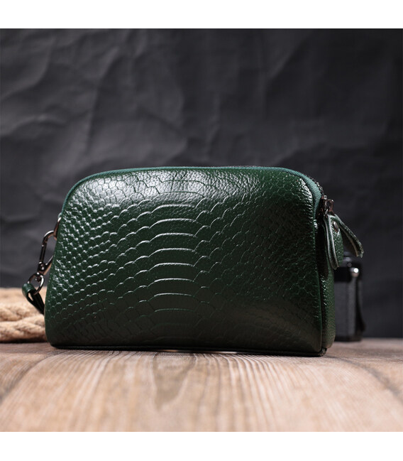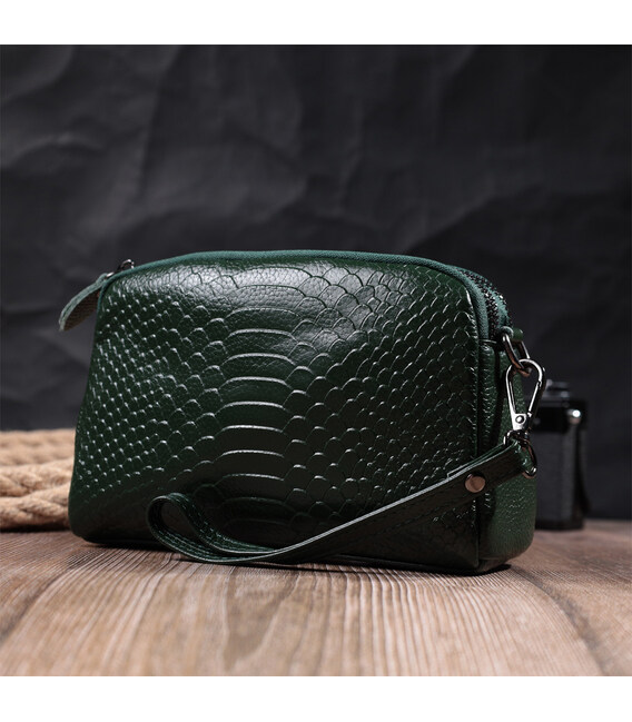 Гарна жіноча сумка з натуральної шкіри високої якості з тисненням під змію. Виріб дуже зручний, можна носити на плечі та через плече, на кисті та просто під рукою як клатч. Модель доповнена фурнітурою кольору темного срібла. Аксесуар має два основні відділення у яких дві кишеньки - одна на блискавці та одна відкритого типу, а також кишеня на блискавці зовні, на тильній стороні. Ідеальний варіант для будь-якої дівчини, яка цінує якість і має чудовий смак.