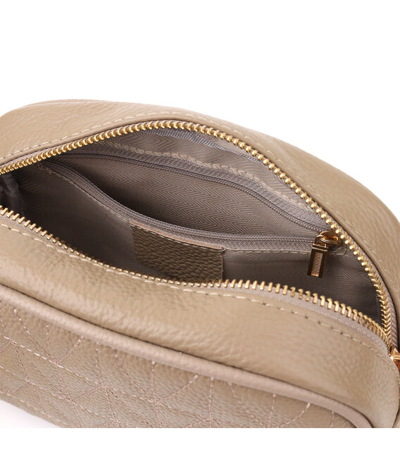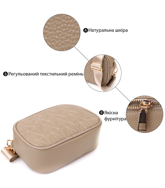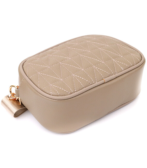 Красива бежева стьобана сумка Vintage із натуральної шкіри стане стильним та універсальним аксесуаром. М'яка, але при цьому щільна шкіра підкреслює високу якість виробу і робить сумку особливо приємною на дотик. Компактна форма надає моделі акуратного та вишуканого вигляду, а стібка на лицьовій стороні додає дизайнерський шарм. Сумка закривається на блискавку, всередині розташоване основне відділення з кишенею на блискавці та відкритою кишенею для дрібниць, а на тильній стороні знаходиться зовнішня кишеня на блискавці для зручного зберігання необхідних речей. Знімний текстильний ремінь, що регулюється, забезпечує комфорт при носінні, а фурнітура під жовте золото стильно відтіняє теплий бежевий колір шкіри. Ця сумка стане ідеальним супутником як для повсякденних образів, так і для особливих випадків, підкреслюючи витончений смак та любов до якісних матеріалів.