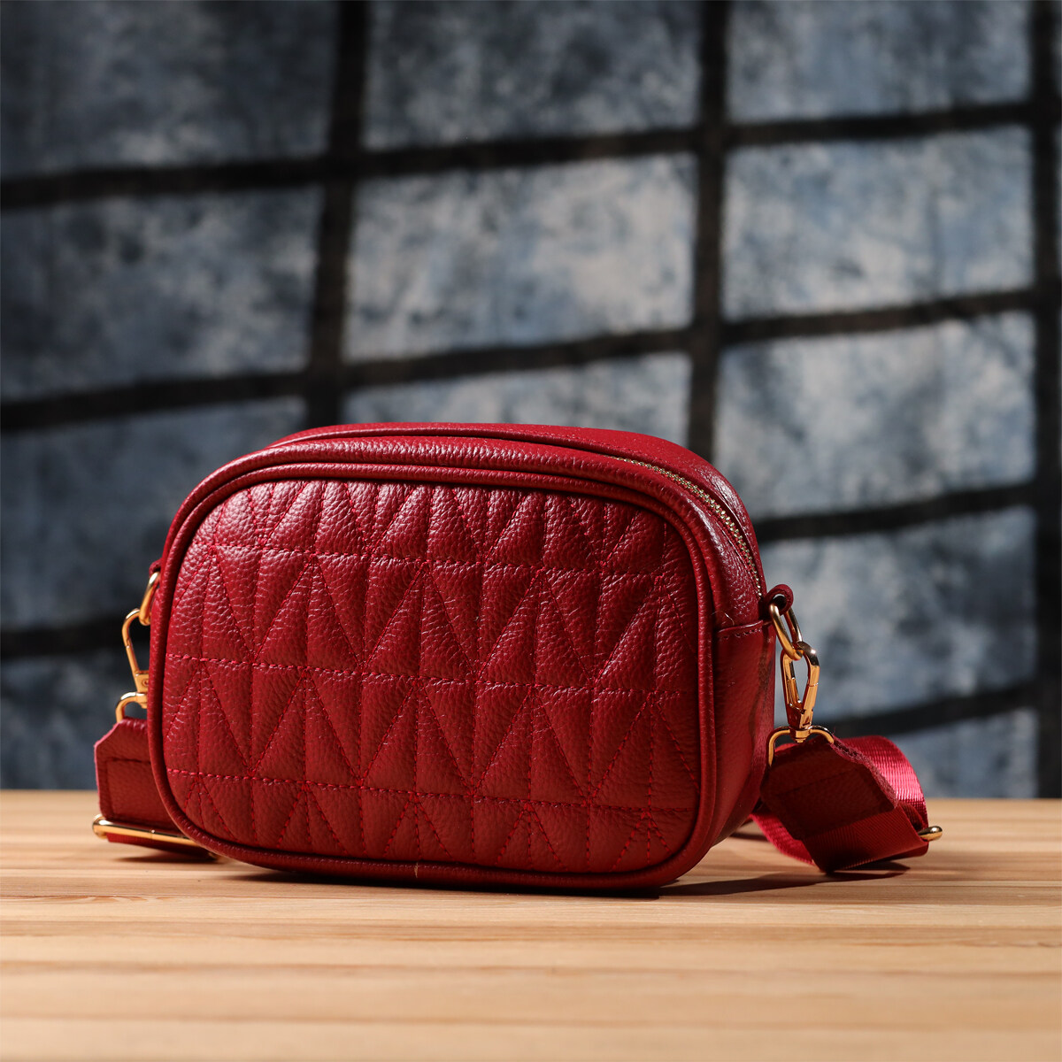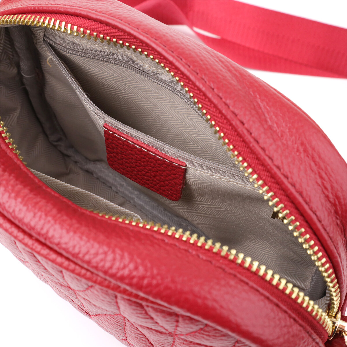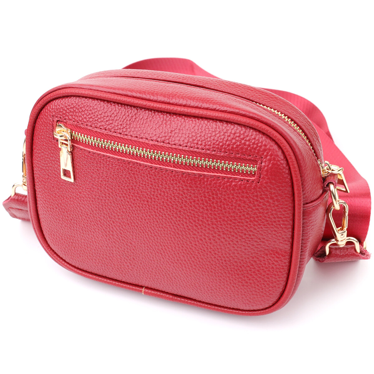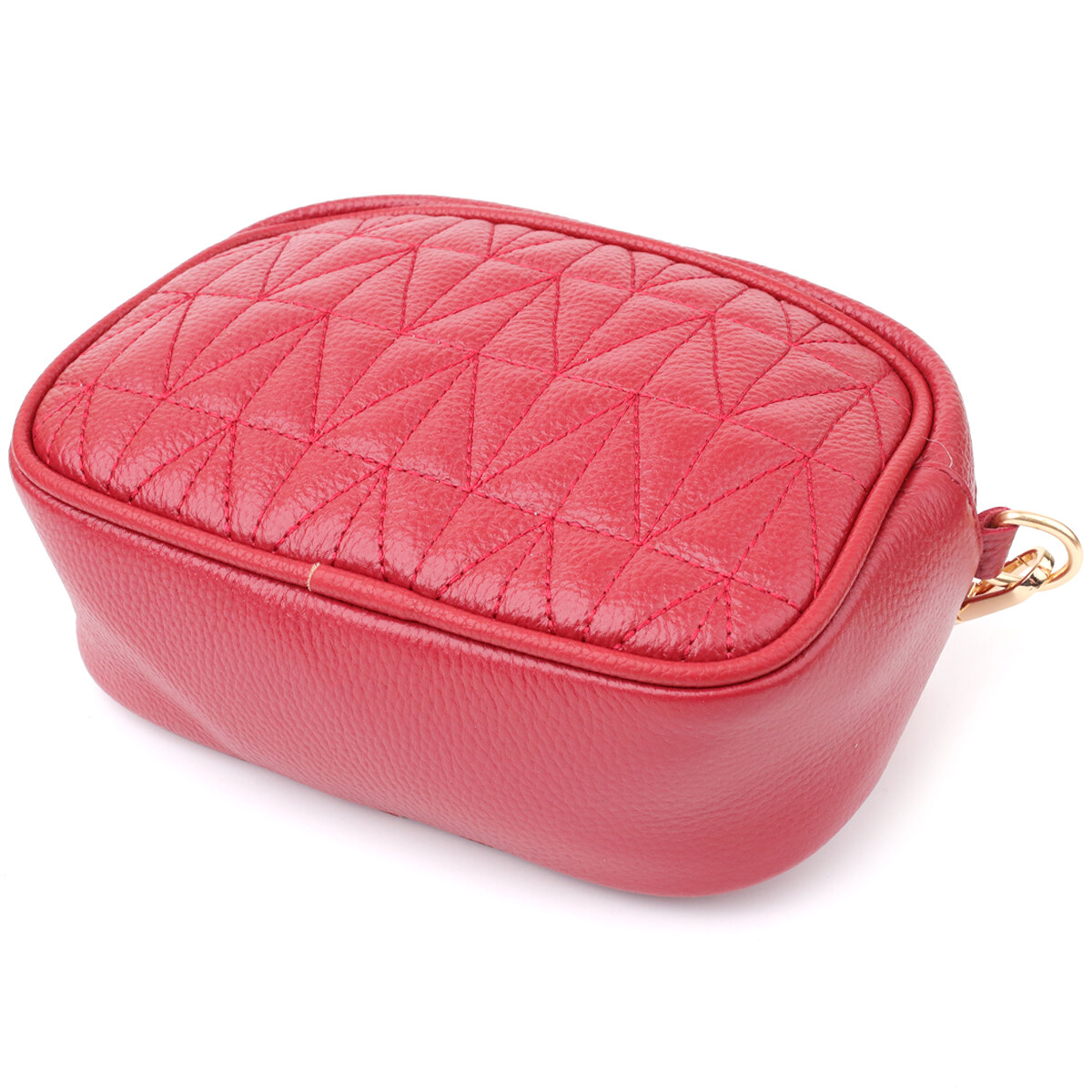 Стьобана сумка для жінок у насиченому червоному кольорі з натуральної шкіри стане ефектним акцентом вашого образу, додаючи яскравості та харизми. Якісна щільна шкіра приємна на дотик і підкреслює високий рівень виконання. Компактна чітка форма робить модель зручною та акуратною, а стібка на лицьовій стороні надає їй витонченого дизайнерського характеру. Сумка закривається на блискавку, всередині знаходиться основне відділення з кишенею на блискавці та відкритою кишенею для дрібниць, а на тильній стороні передбачена зовнішня кишеня на блискавці для швидкого доступу до потрібних речей. Знімний текстильний ремінь, що регулюється, забезпечує комфорт при носінні, а фурнітура під жовте золото стильно відтінює насичений червоний відтінок шкіри. Ця сумка стане універсальним аксесуаром для повсякденних виходів та особливих випадків, підкреслюючи смак та увагу до деталей.