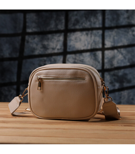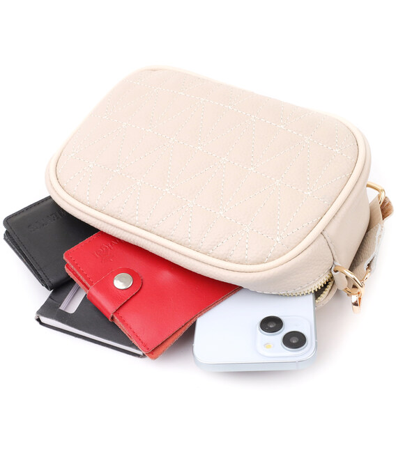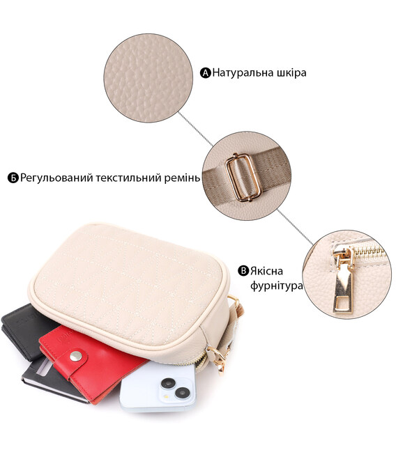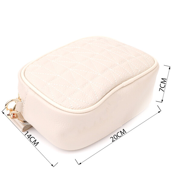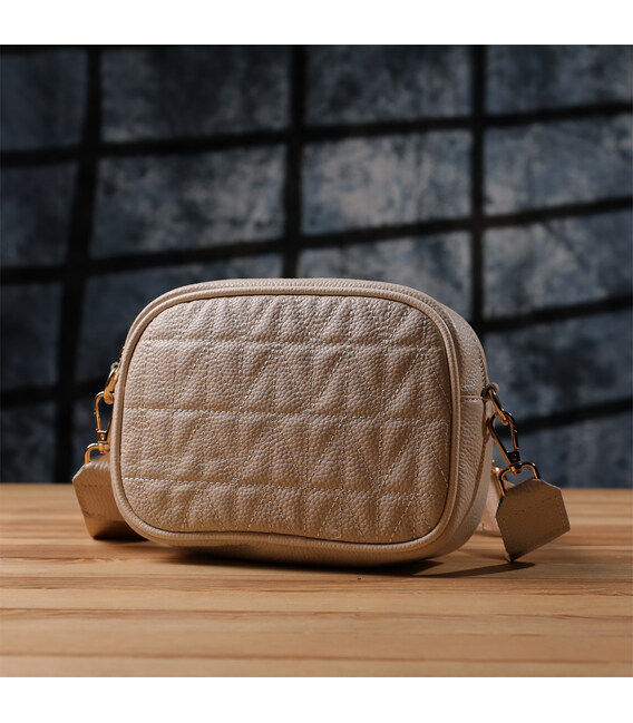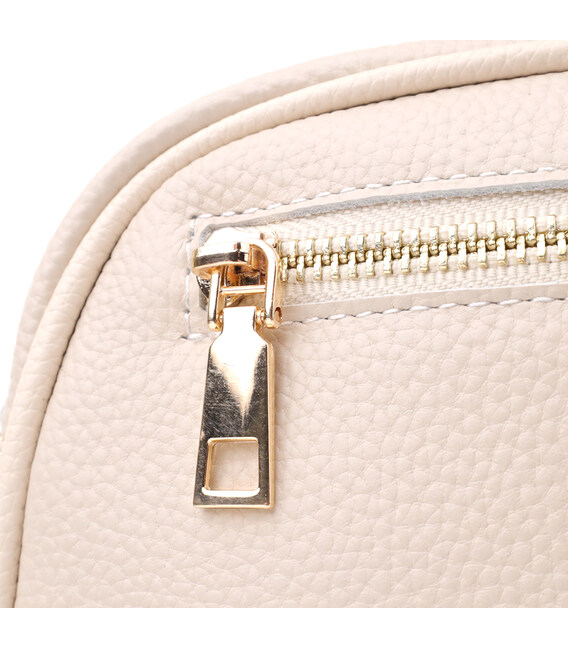 Сумка жіноча в ніжному білому кольорі з натуральної шкіри стане елегантним і вишуканим акцентом вашого образу. М'яка, але щільна шкіра приємна на дотик і підкреслює високу якість виробу. Компактна чітка форма робить модель акуратною та зручною, а стібка на лицьовій стороні додає витонченого дизайнерського характеру. Сумка закривається на блискавку, всередині розташоване основне відділення з кишенею на блискавці та відкритою кишенею для дрібниць, а на тильній стороні є зовнішня кишеня на блискавці для швидкого доступу до потрібних речей. Знімний текстильний ремінь, що регулюється, забезпечує комфорт при носінні, а фурнітура під жовте золото гармонійно відтіняє світлий білий тон шкіри. Ця сумка стане універсальним аксесуаром для повсякденних виходів та особливих випадків, підкреслюючи витончений смак та любов до якісних матеріалів.