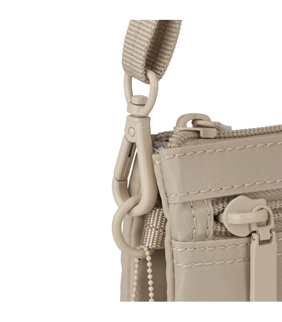 Зручна жіноча сумка через плече, маленького розміру виготовлена з міцної тканини з знімним ременем, що дозволяє регулювати довжину. У виробі є три відділення на блискавці, в одному з яких є слоти для карт і RFID-захист, кишеня для документів, телефону і дрібниць. На фасадній частині розташована кишеня на блискавці.