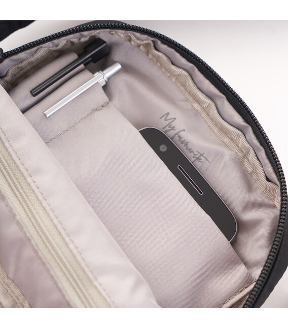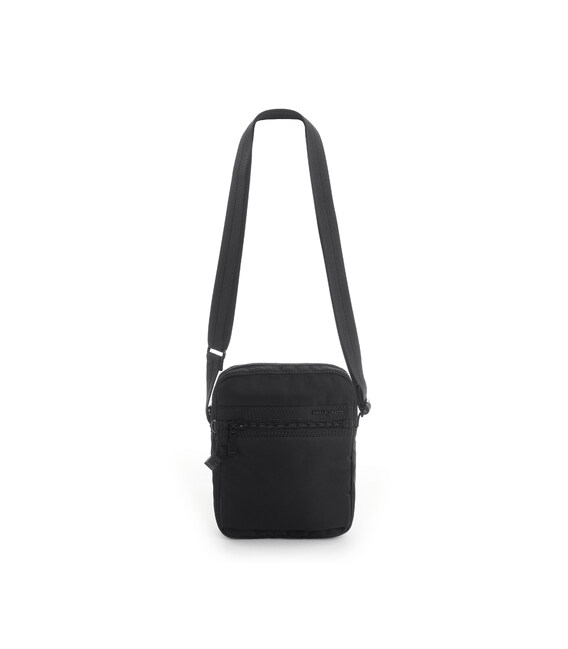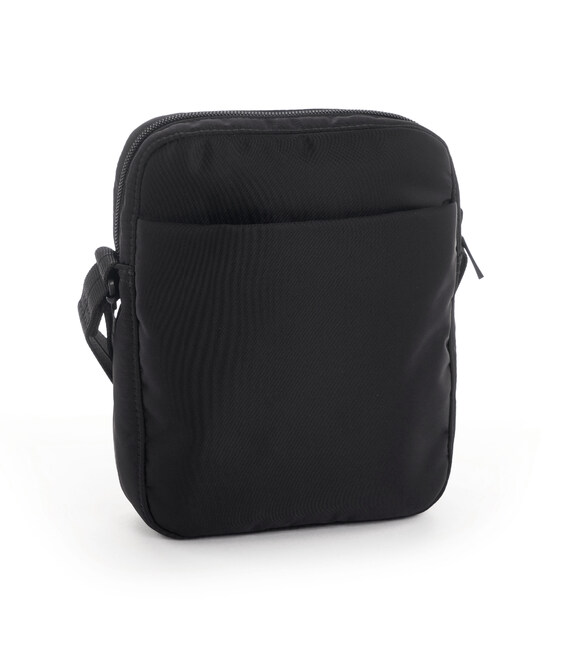 Маленька сумка-кросовер з міцної тканини, оснащена плечовим ременем з можливістю регулювання довжини. У виробі одне основне відділення, яке оснащене додатковою, внутрішньою кишенею, також кишенею для смартфона. На фасадній частині розташована кишеня на блискавці. На задній частині розташована кишеня з RFID-захистом від шахрайства. Виріб декорований брелоком з назвою бренду.