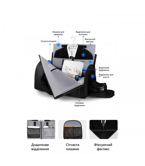 Основним акцентом цієї сумки є костюмне відділення, яке може розкладатися на 180 градусів, забезпечуючи організований та безпечний транспорт піджаків, сорочок, штанів чи суконь. Костюмне відділення також служить стінками для основного відсіку, надаючи додаткову жорсткість та захист.