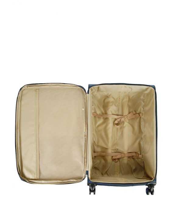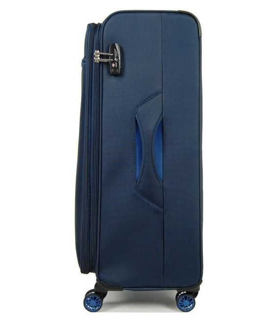 Данна валіза виготовлена з спеціально розроблених легких компонентів, завдяки яким зменшується вага валізи, що є вирішенням проблеми обмеження ваги багажу під час авіаперельотів. Всі основні елементи валізи виготовлені з легких матеріалів і міцної тканини. Ця модель відрізняється високою маневреністю і легкістю в управлінні, завдяки чотириколісній системі (чотири колеса з міцного і безшумного матеріалу, що обертаються на 360 градусів). В якості тканини вибрали нейлон, який має високу щільність (800D) та володіє водовідштовхувальними властивостями. Крім того, цей матеріал легко очищається від бруду і не піддається механічній деформації. Є розширення, яке дозволить збільшити обсяг валізи коли це необхідно. Каркас цієї валізи складається з гнучких поліпропіленових пластин і ущільненого дна, за рахунок чого, не тільки прекрасно тримає свою форму, але і дозволяють зберігати в цілості всі предмети знаходяться в середині. Одяг може бути акуратно закріплений на фіксуючих ременях. Також в середині валізи розміщений велика бічна кишеня-сітка, ззовні, для невеликих речей розташована кишеня в якій зручно складати все, що необхідно в дорозі.