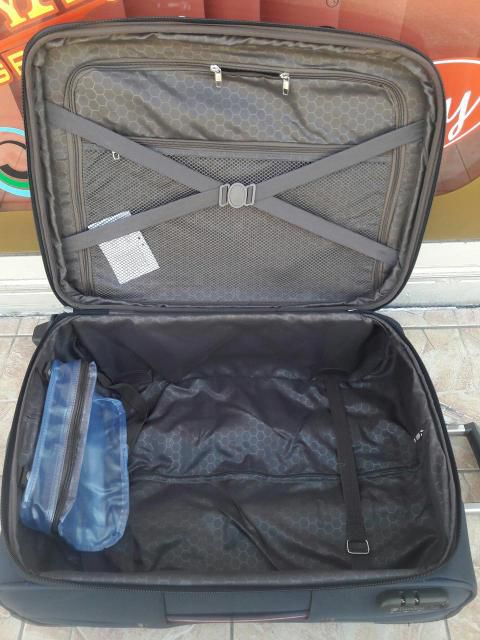На бічній стороні валізи є вбудований кодовий замок. Усередині валізи є 2 відділення, одне з притискними ременями, інше закривається на блискавку. На одній зі сторін є кишеня для дрібниць на блискавці. Як видно на фото, всередині великого відділу на кнопки кріпиться дорожня косметичка з прозорого пластика, дуже зручне доповнення даної моделі.