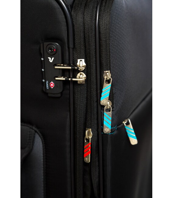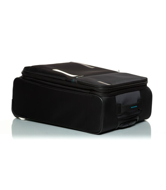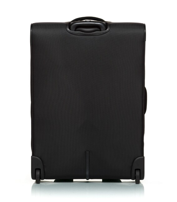 Валіза оснащена двома міцними колесами. На верхній панелі розташована текстильна підйомна ручка, для зручності переміщення є телескопічна ручка. На фронтальній поверхні є глибока кишеня, що закривається на блискавку, а також невелика кишеня на блискавці з двома бігунками і стримуючими кутами.