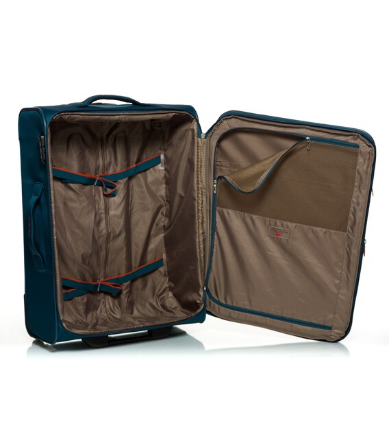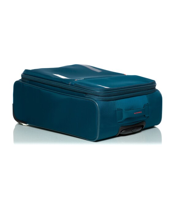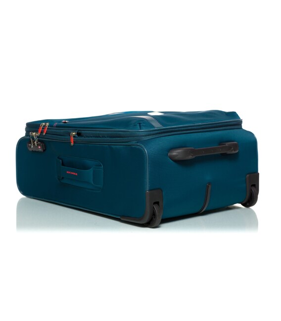 Валіза оснащена двома міцними колесами. На верхній панелі розташована текстильна підйомна ручка, для зручності переміщення є телескопічна ручка. На фронтальній поверхні є глибока кишеня, що закривається на блискавку, а також невелика кишеня на блискавці з двома бігунками і стримуючими кутами.