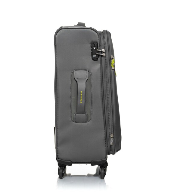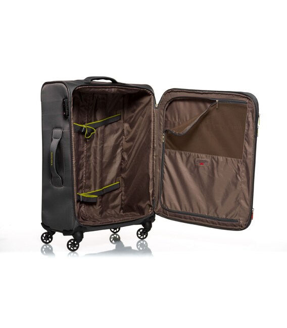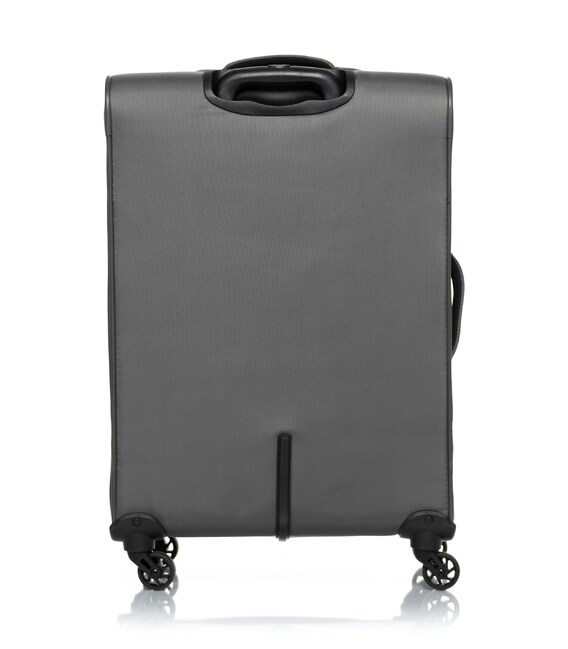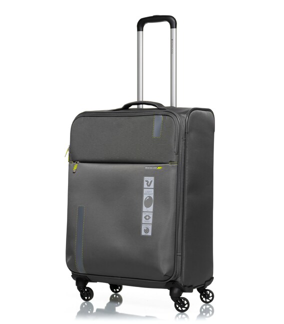 Валіза оснащена чотирма міцними колесами. На бічній поверхні і зверху розташовані текстильні підйомні ручки, для зручності переміщення є телескопічна ручка. На фронтальній поверхні є глибока кишеня, що закривається на блискавку, а також невелика кишеня на блискавці з двома бігунками і стримуючими кутами.