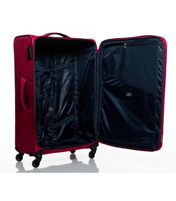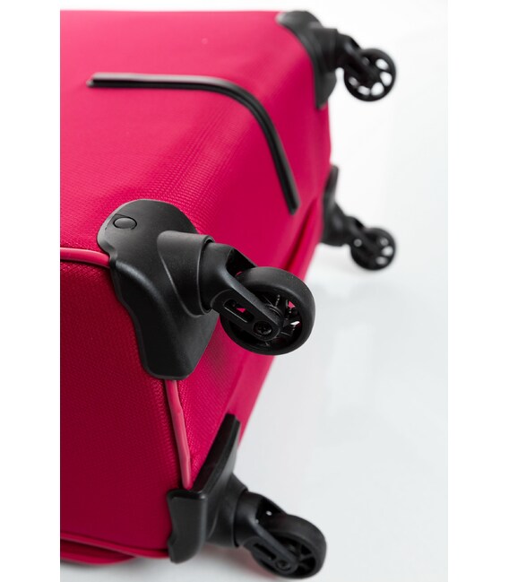 Велика валіза виготовлена з нейлону - міцного і зносостійкого матеріалу, оснащена чотирма маневреними колесами, зовні має кишеню на блискавці. Також, виріб має систему розширення, завдяки якій є можливість збільшити обсяг валізи; просту і практичну внутрішню організацію з двома відсіками. Чемодан володіє місткістю і функціональністю.