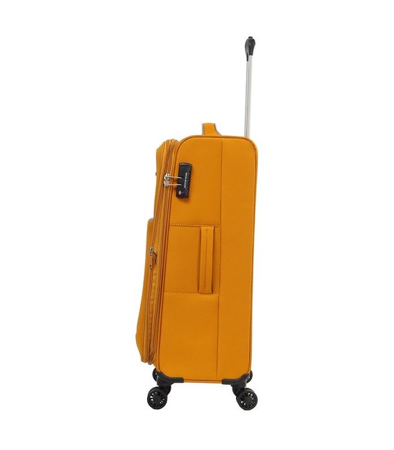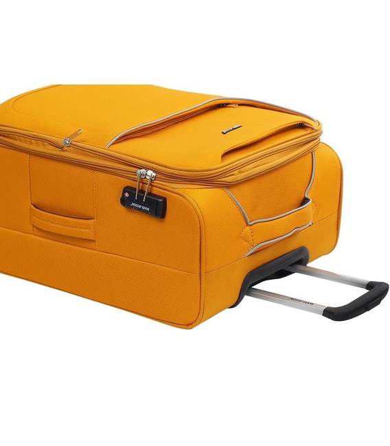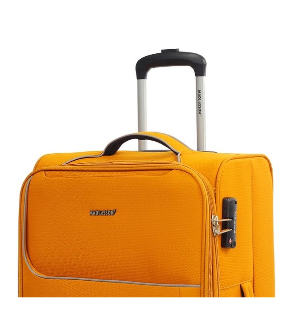Дорожній текстильний чемодан від французького виробника Madisson. Матеріал корпусу виконаний з нейлону щільністю 900D. Тканина еластична, а також володіє водовідштовхувальними властивостями. Усередині 2 лотка, допіленних безліччю кишень і сіточок для зручності організації зібраних речей. Валізи комплекту в розмірах M-L мають блискавку розширювач. Чемодан обладнаний TSA-замком, що спрощує процедуру митного огляду. Шасі складається з 4 незалежних коліс, з поліуретану, колеса обертаються на 360 градусів, що забезпечує кращу маневреність. Усередині валізи є 2 відділення, одне з притискними ременями, інше закривається на блискавку. Зверху і збоку валізи розташовані ручки для перенесення його в вертикальному або горизонтальному положеннях. Висувна телескопічна ручка на металевій основі з кнопкою для фіксації висоти.