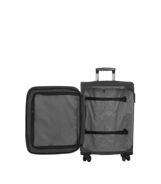 Дивлячись на це з першого погляду, ми розуміємо сучасний стиль валізи 97104 від Snowball, що є важливою перевагою, яка дозволяє легко помітити його, зокрема, на стрічках в аеропорту. Багаж, оснащений 4 здвоєними колесами, забезпечує помітну рухливість під час транспортування, і на цьому не зупиняється. Дійсно, наявність двотрубної перекладини дозволяє легко перекочувати її. Його також можна переносити в руці за дві ручки для перенесення, одна з яких розташована зверху, а інша – з однієї із сторін.