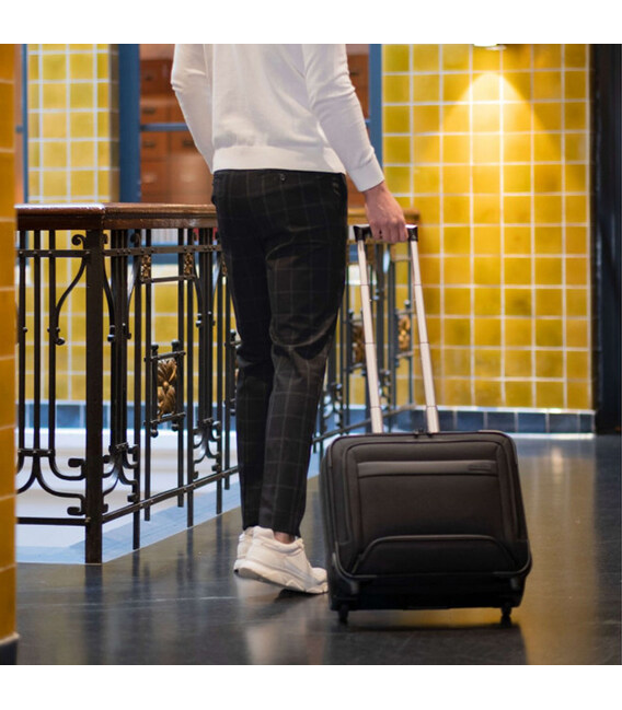 Travelite MEET TL001841 (43x38x20 см / поліестер / Black) – чорний бізнес-кейс на 29 літрів з відділенням для ноутбука 15,6 дюймів та знімним чохлом для речей. Створено спеціально для ділових поїздок, щоб розмістити не лише ваші речі, а й документи, портативну електроніку. Ідеальна ручна поклажа для робочих поїздок.Серія Meet від німецького бренду Travelite – це лінійка багажної атрибутики бізнес-класу. Повністю присвячена діловим аксесуарам, надаючи професіоналам все необхідне для функціонального та ефективного перенесення повсякденних технологічних аксесуарів. Виготовлена із якісного поліестерового текстилю високої щільності. Естетичний зовнішній вигляд та бездоганна функціональність.Детальна інформація про модель Travelite 01841 01✔ Серія дорожнього багажу MEET.✔ Зовнішній матеріал – поліестер – цупкий текстурований текстиль.✔ Протектори в зонах, найбільш схильних до зношування.✔ Дизайн/колір: Black (чорний).✔ Відповідає параметрам ручної поклажі.✔ Якісні багажні блискавки з двома бігунками.✔ На спинці є ремінець для фіксації на висувній ручці більшого багажу.✔ Легкий хід висувної ручки з кількома точками фіксації висоти.✔ 2 колеса та передні ніжки-упори.✔ Міцна верхня ручка для перенесення в руках.• Основне глибоке відділення із роздільниками.• Знімний чохол на блискавці для речей.• Відділення із м'якою кишенею для ноутбука до 15,6 дюймів.• Переднє відділення з організаційною панеллю для ручок, банківських карток та з карабіном для ключів.• Лицьова кишеня на блискавці.• Кишеня внизу передньої панелі, де зручно зберігати парасольку.