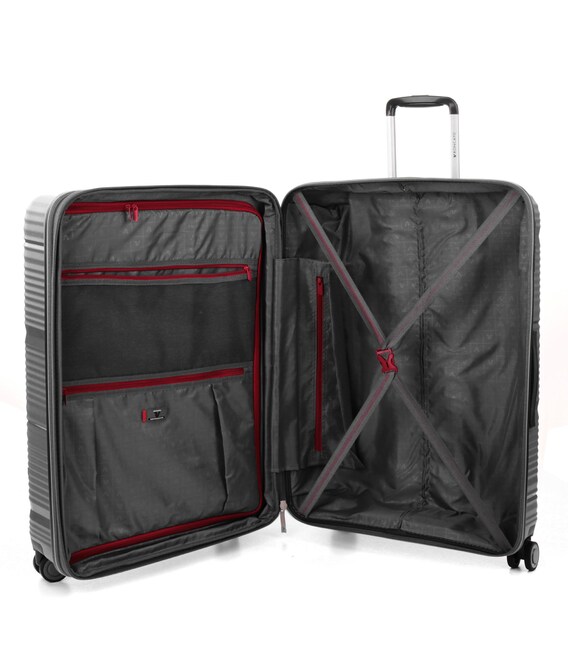 Великий чемодан підходить для тривалих поїздок або для всієї родини. Оснащений 4 спареними, безшумними і маневреними колесами. Для зручності переміщення передбачені еластичні, підйомні пластикові ручки на верхній і бічний панелях, а також телескопічна ручка. Безпека і збереження багажу забезпечує вбудований кодовий замок з системою TSA. Чемодан закривається на блискавку і має відмінну внутрішню організацію.
