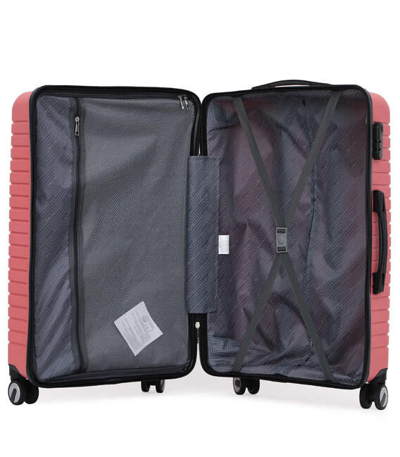 - Валіза має текстильну перегородку на блискавці, яка розділяє внутрішній простір на два основні відділення, та оснащена кишенею на блискавці для дрібних речей.