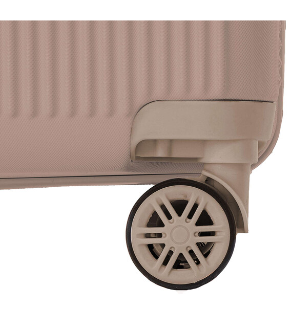 - Повноповоротні колеса - дана модель оснащена чотирма обертовими на 360 ° здвоєними колесами. Здвоєні колеса забезпечують кращий розподіл ваги та стійкість валізи, відмінне зчеплення, маневреність та мають більшу зносостійкість. Колеса кріпляться на 5 гвинтів зсередини, що забезпечує максимальну стійкість при ударному навантаженні з будь-якого боку і дозволяє їх замінити у разі зносу.