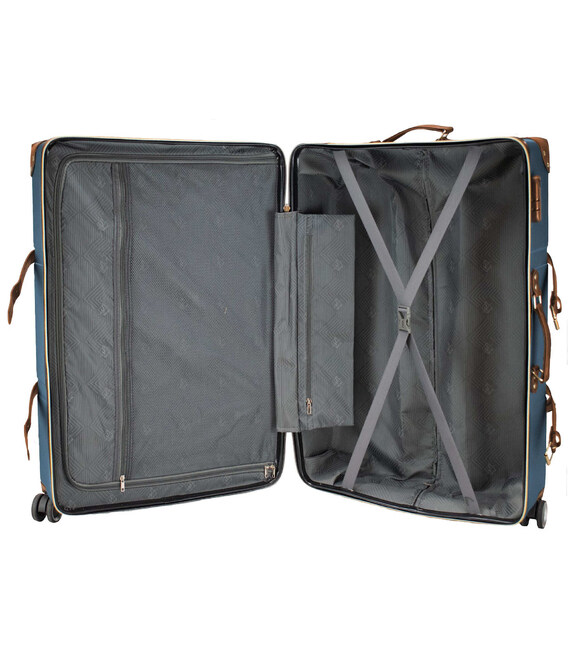 - Валіза має текстильну перегородку на блискавці, яка розділяє внутрішній простір на два основні відділення, та оснащена кишенею на блискавці для дрібних речей.
