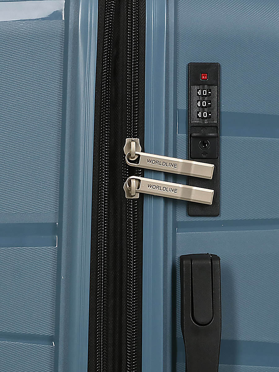 Розширювана валіза Worldline Kos має 4 подвійних обертових колеса на 360° для плавного переміщення в будь-якому напрямку. Його візок з подвійною вудкою можна відрегулювати в кількох положеннях, щоб забезпечити зручне керування для кожного. Щоб підняти його без зусиль, щоб піднятися на кілька сходинок, він оснащений високою ручкою та м’якою боковою ручкою. Захисні посилення, розташовані збоку, обмежують знос його оболонки під час розміщення його для доступу до вмісту. Його система застібки-блискавки оснащена кодовим замком, який допомагає захистити внутрішню частину.