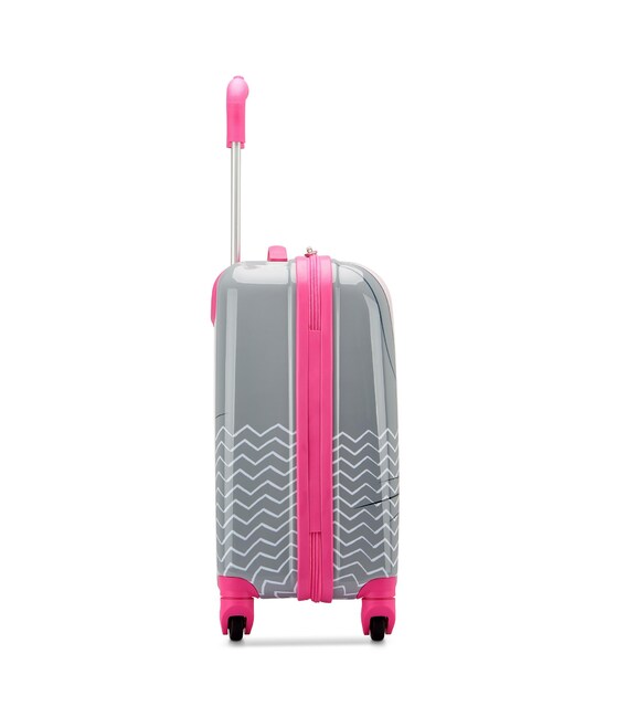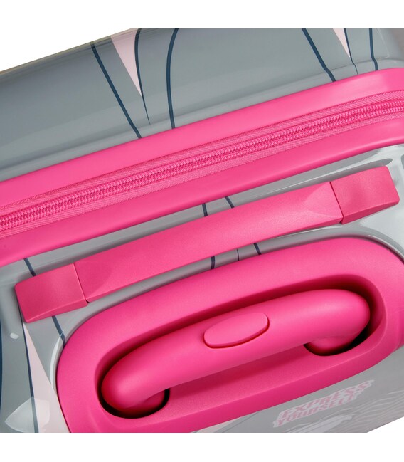 Маленький чемодан оснащений 4 маневреними колесами. Для зручності переміщення передбачена еластична, підйомна пластикова ручка на верхній панелі, також телескопічна ручка. Блискавка передбачає можливість розміщення навісного замку для додаткової безпеки. Внутрішня організація з еластичними ременями для фіксації одягу, перегородками на блискавці та кишенями для білизни. Також, в комплект до валізи йдуть тематичні наліпки, для власного, індивідуального дизайну юного мандрівника.