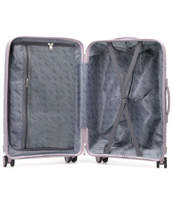 - Валіза має текстильну перегородку на блискавці, яка розділяє внутрішній простір на два основні відділення, та оснащена кишенею на блискавці для дрібних речей.