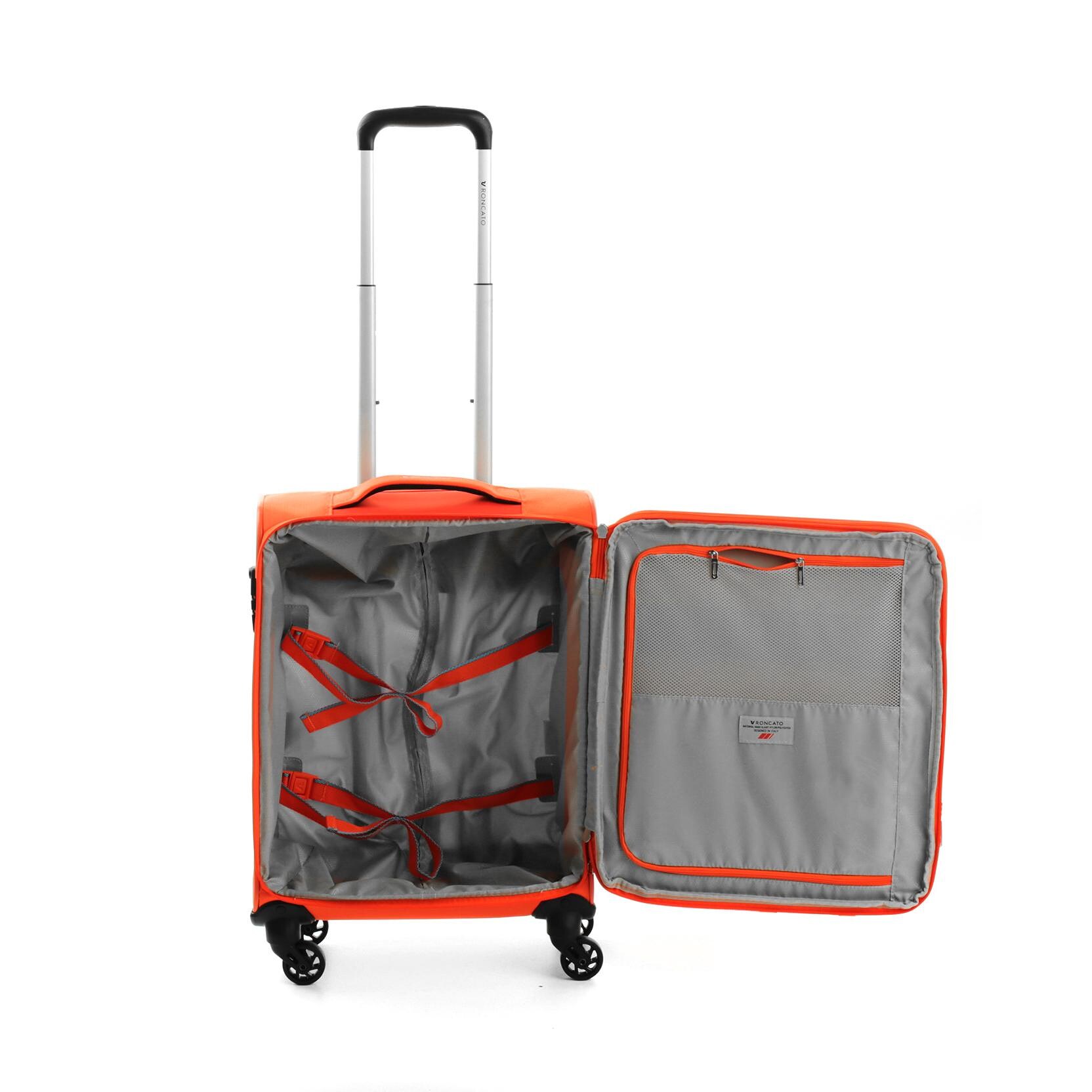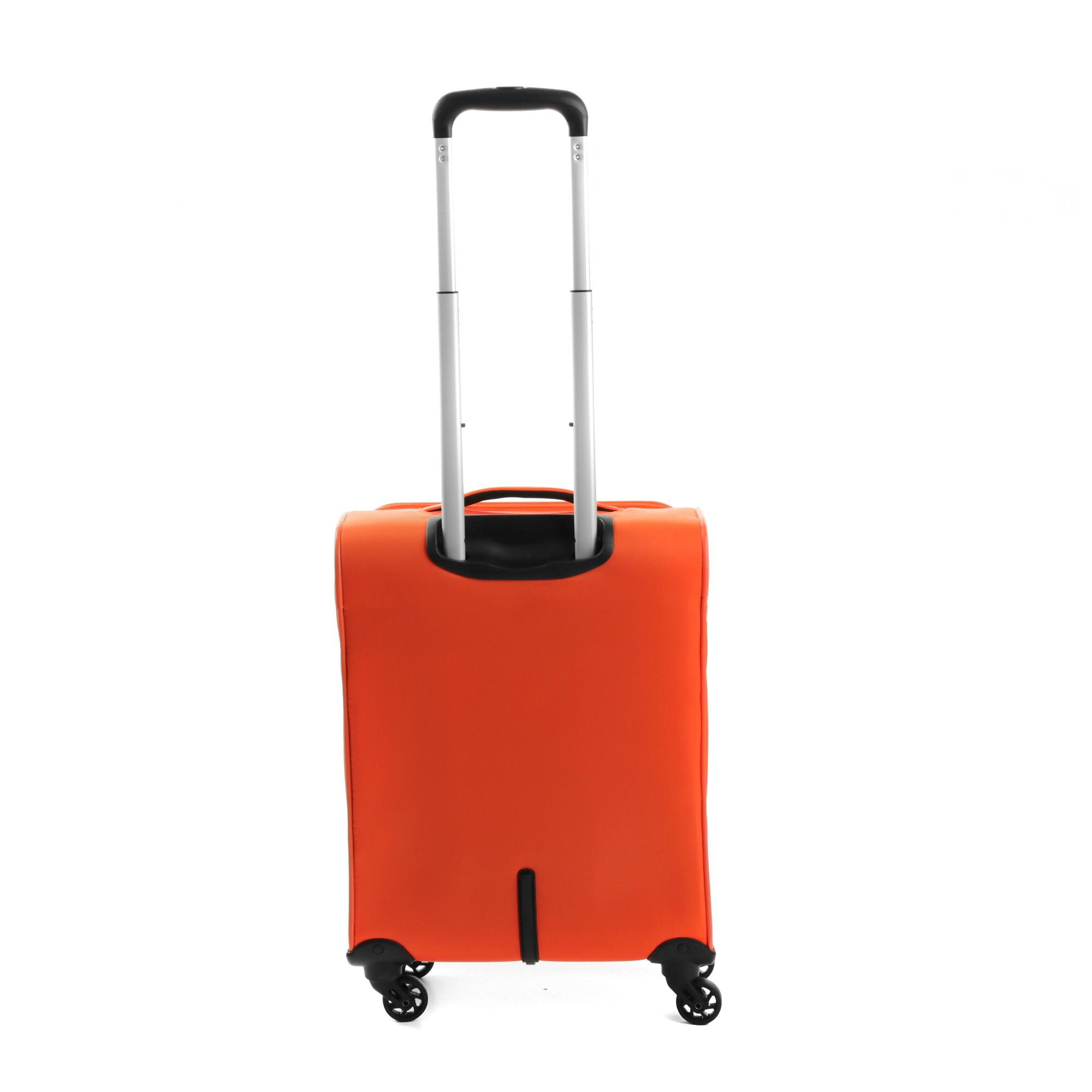 Валіза оснащена чотирма міцними колесами. На верхній панелі розташована текстильна підйомна ручка, для зручності переміщення є телескопічна ручка. На фронтальній поверхні є глибока кишеня, що закривається на блискавку, а також невелика кишеня на блискавці з двома бігунками і стримуючими кутами.
