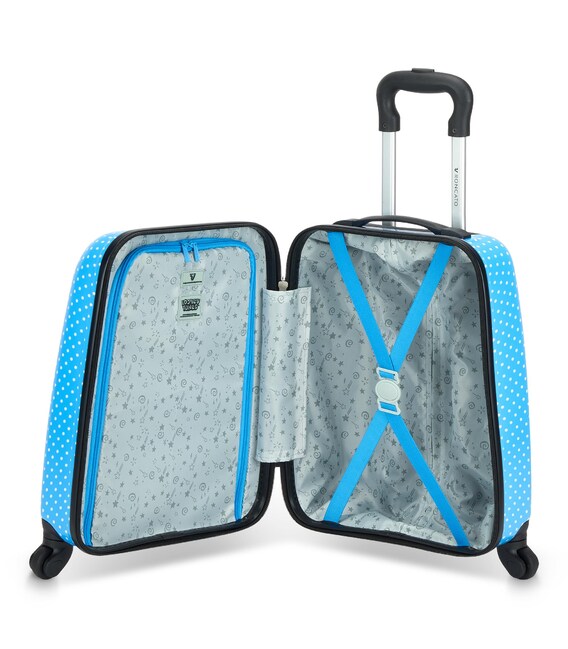 Маленький чемодан оснащений 4 маневреними колесами. Для зручності переміщення передбачена еластична, підйомна пластикова ручка на верхній панелі, також телескопічна ручка. Блискавка передбачає можливість розміщення навісного замку для додаткової безпеки. Внутрішня організація з еластичними ременями для фіксації одягу, перегородками на блискавці та кишенями для білизни. Також, в комплект до валізи йдуть тематичні наліпки, для власного, індивідуального дизайну юного мандрівника.
