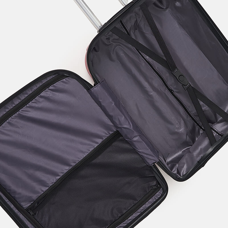 Модель оснащена спареними колесами, що обертаються на 360 °. Висувна телескопічна, алюмінієва ручка із трьома рівнями фіксації. Кодовий замок для захисту ваших особистих речей. Дві ручки з силікону у верхній та бічній частині валізи для транспортування у вертикальному та горизонтальному положенні. Пластикові ніжки для розташування валізи в горизонтальному положенні. Валіза має 1 основне відділення з перегородкою з поліестру, на перегородці є 1 додаткове сітчасте відділення. Еластичні компресійні ремені на фастекс призначені для фіксації речей усередині валізи. Також валіза має блискавку на підкладці з двох сторін, для доступу до внутрішньої частини валізи де знаходяться колеса та механізм ручки. Висота валізи без урахування коліс - 58см.