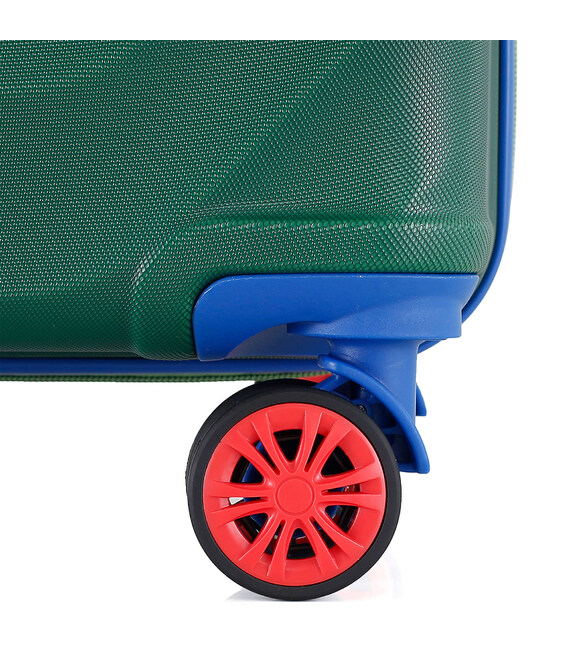 - Повноповоротні колеса - дана модель оснащена чотирма обертовими на 360° здвоєними колесами. Здвоєні колеса забезпечують кращий розподіл ваги та стійкість валізи, відмінне зчеплення, маневреність та мають більшу зносостійкість. Колеса кріпляться на 4 гвинти зсередини, що забезпечує максимальну стійкість при ударному навантаженні з будь-якого боку і дозволяє їх замінити у разі зносу.