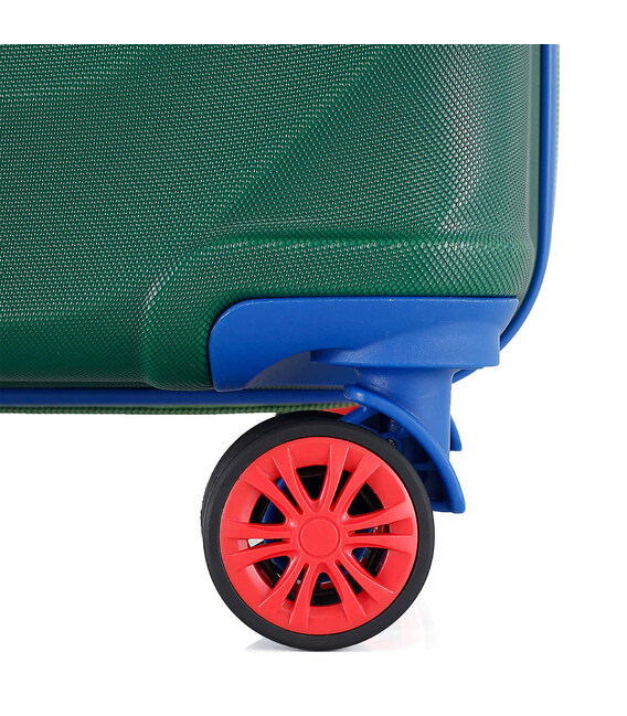 - Повноповоротні колеса - дана модель оснащена чотирма обертовими на 360 ° здвоєними колесами. Здвоєні колеса забезпечують кращий розподіл ваги та стійкість валізи, відмінне зчеплення, маневреність та мають більшу зносостійкість. Колеса кріпляться на 4 гвинти зсередини, що забезпечує максимальну стійкість при ударному навантаженні з будь-якого боку і дозволяє їх замінити у разі зносу.