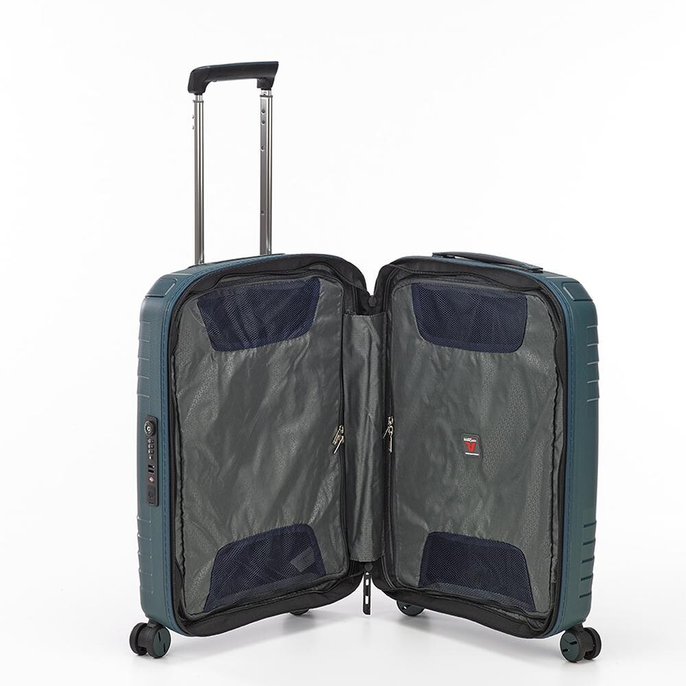 Маленький чемодан підходить для подорожей на не тривалий час, ручна поклажа. Виконаний з 100% поліпропілену, матеріал, який володіє гнучкістю, незвичайною стійкістю до ударів і стійкістю до деформацій і вигоряння. Для зручності переміщення чемодан оснащений чотирма спареними колесами, що обертаються на 360 градусів, регульованою телескопічною ручкою і ручкою для перенесення на верхній частині валізи.