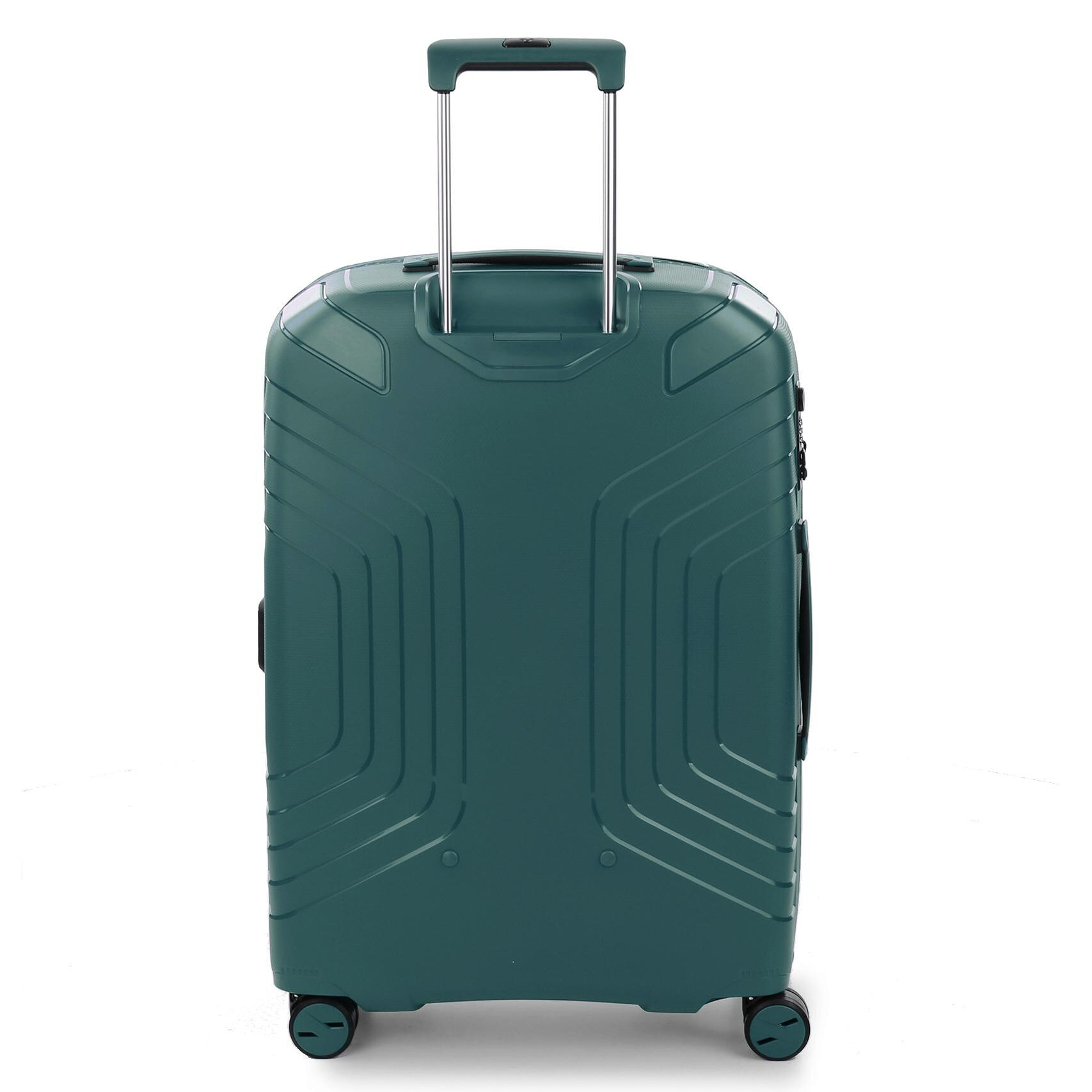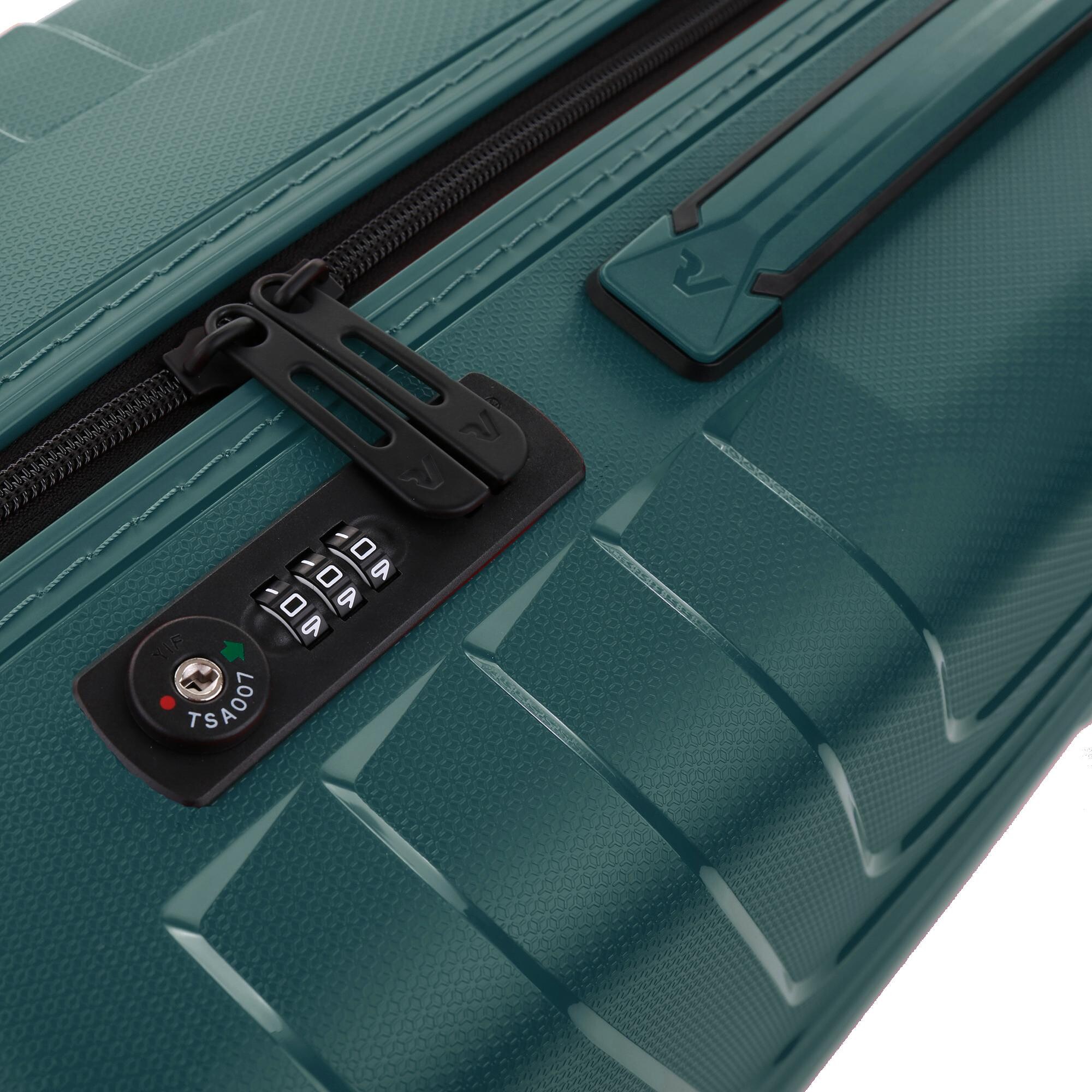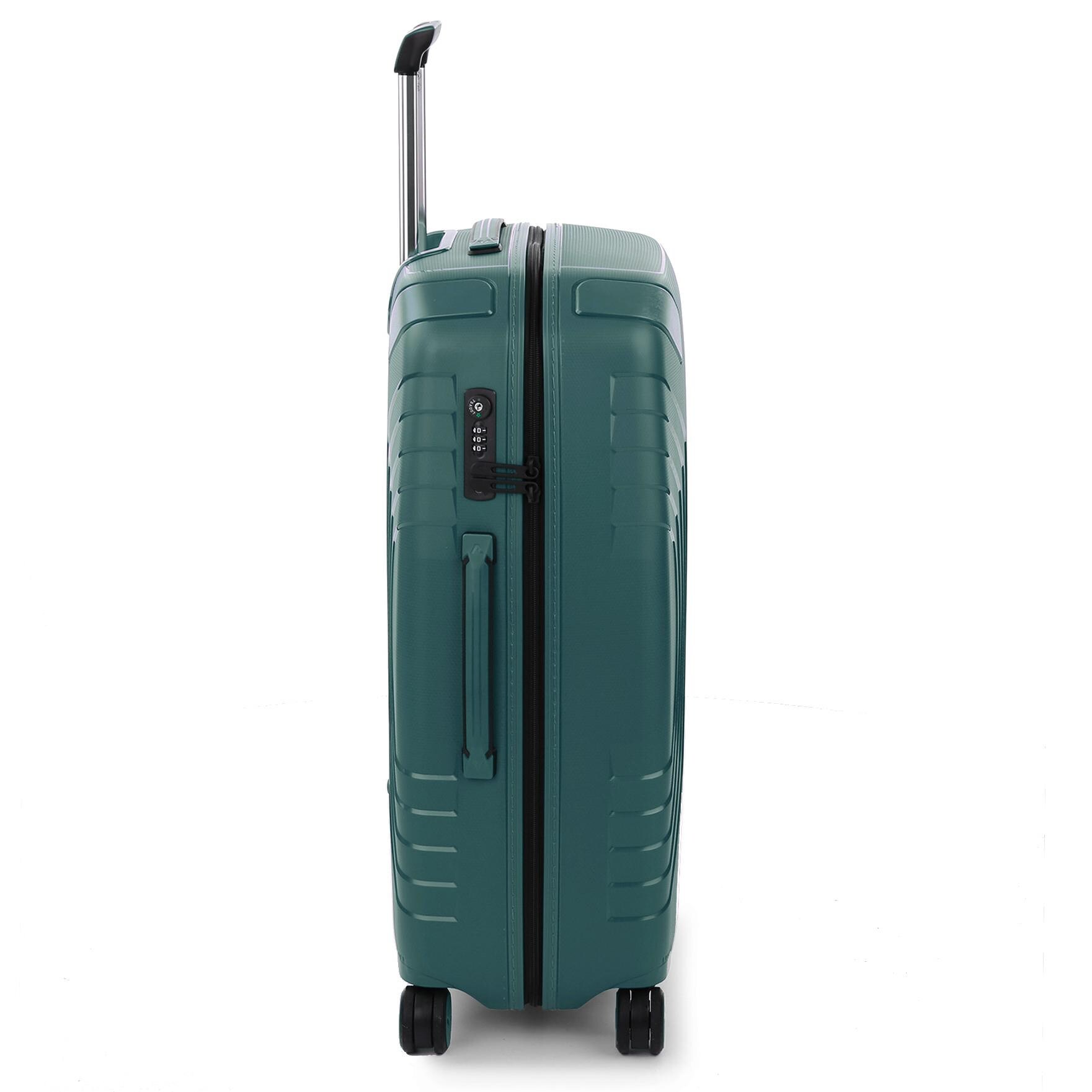 Середній чемодан підходить для подорожей на тривалий час. Виконаний з 100% поліпропілену, матеріал, який володіє гнучкістю, незвичайною стійкістю до ударів і стійкістю до деформацій і вигоряння. Для зручності переміщення чемодан оснащений чотирма спареними колесами, що обертаються на 360 градусів, регульованою телескопічною ручкою і ручкою для перенесення на верхній і бічній частині валізи.