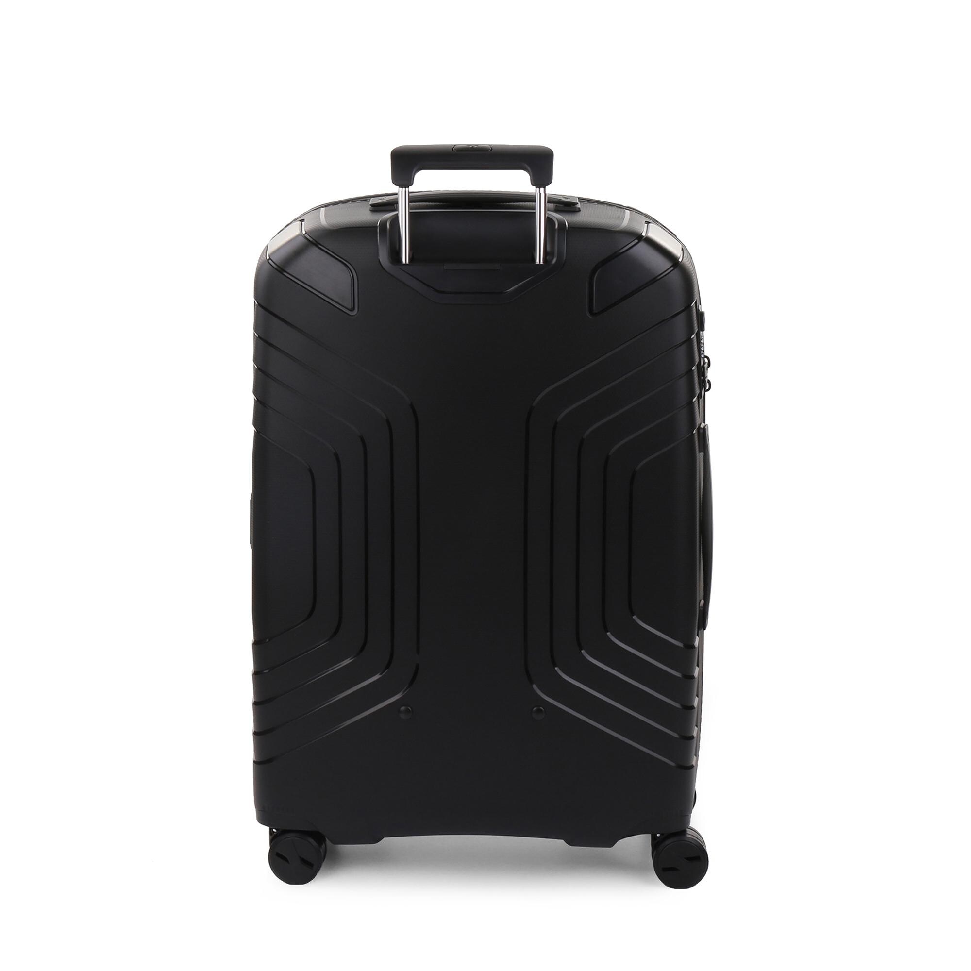 Великий чемодан підходить для подорожей на тривалий час, для всієї родини. Виконаний з 100% поліпропілену, матеріал, який володіє гнучкістю, незвичайною стійкістю до ударів і стійкістю до деформацій і вигоряння. Для зручності переміщення чемодан оснащений чотирма спареними колесами, що обертаються на 360 градусів, регульованою телескопічною ручкою і ручкою для перенесення на верхній і бічній частині валізи.