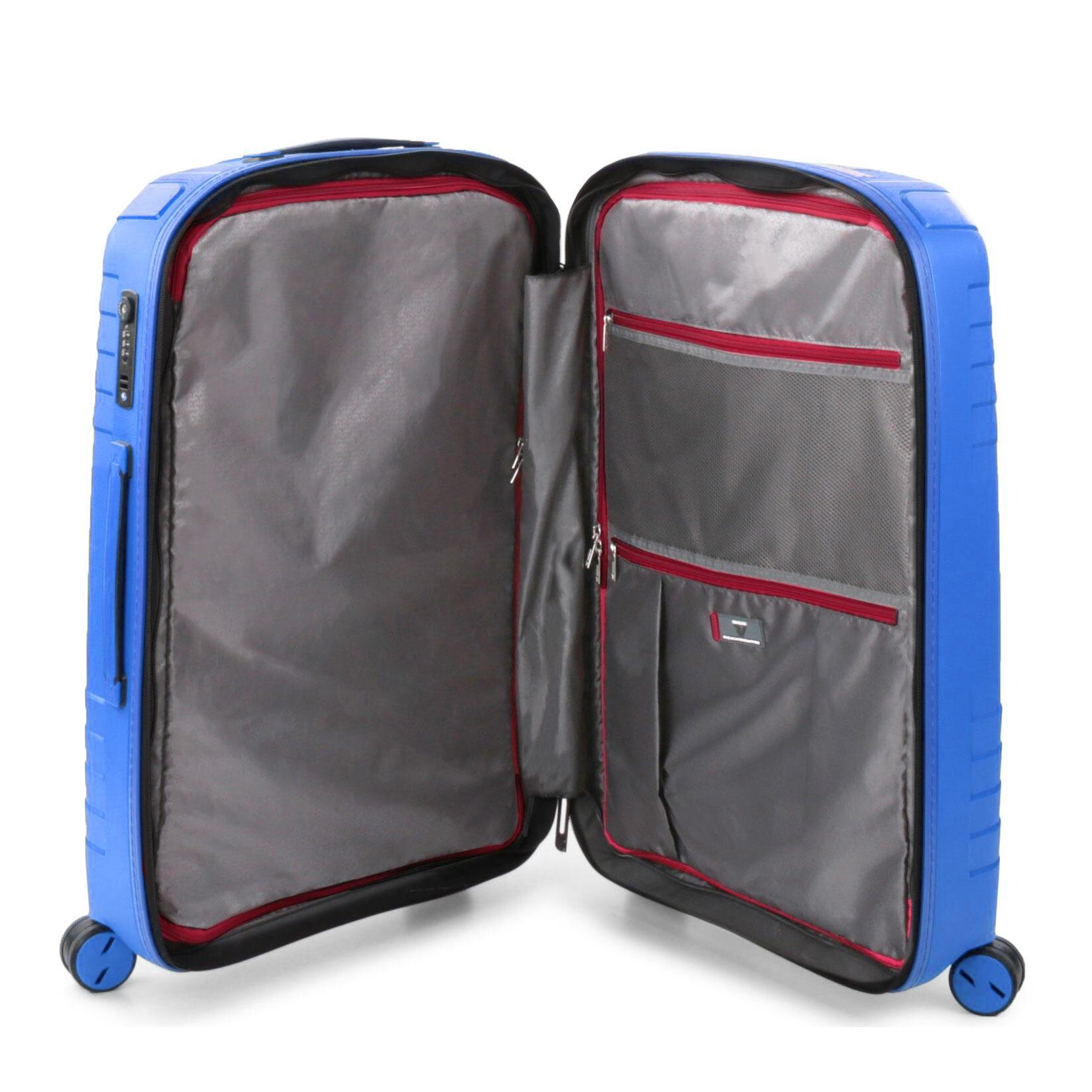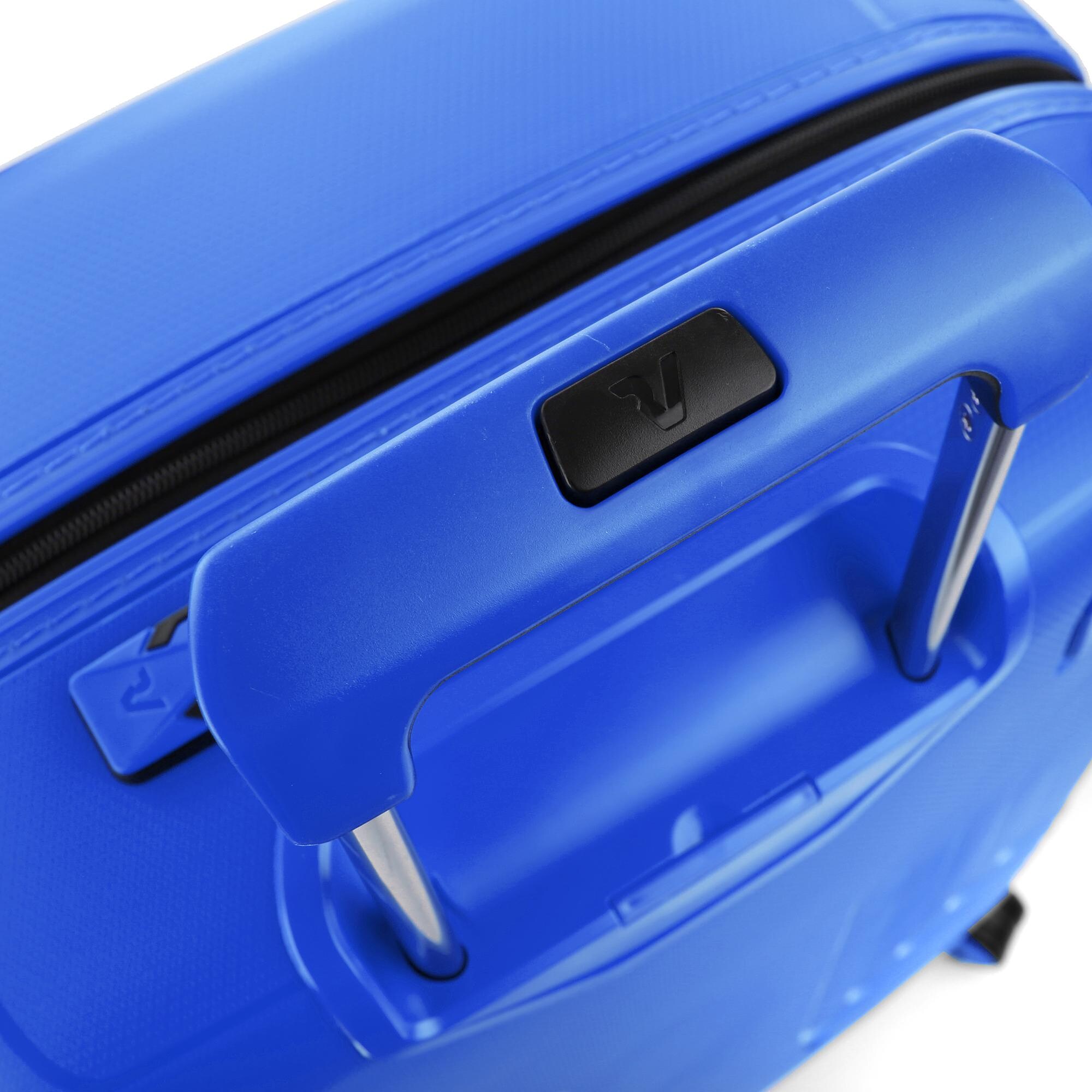 Середній чемодан підходить для подорожей на тривалий час. Виконаний з 100% поліпропілену, матеріал, який володіє гнучкістю, незвичайною стійкістю до ударів і стійкістю до деформацій і вигоряння. Для зручності переміщення чемодан оснащений чотирма спареними колесами, що обертаються на 360 градусів, регульованою телескопічною ручкою і ручкою для перенесення на верхній і бічній частині валізи.