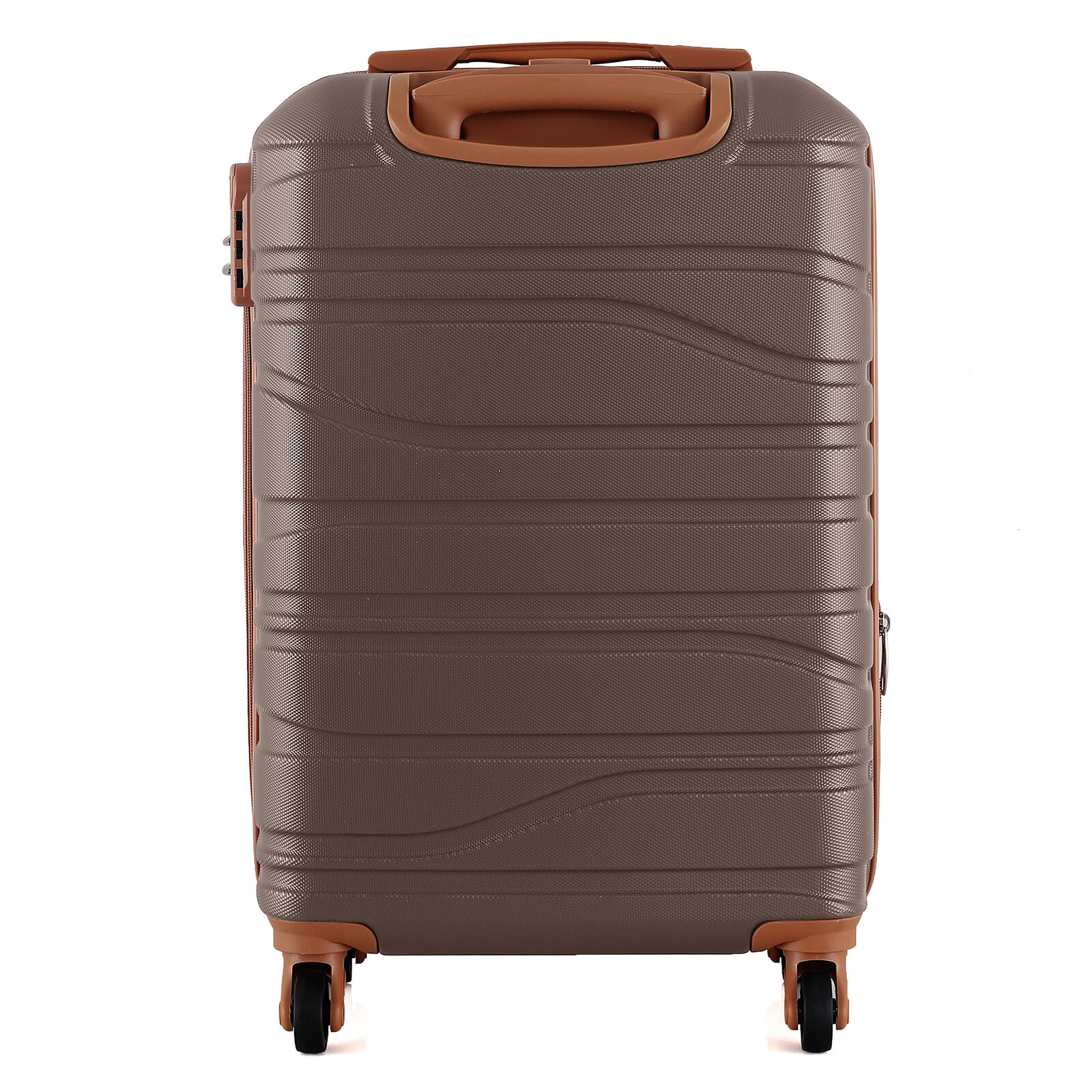 Корпус має рифлене покриття, яке приховує дрібні подряпини, а кодовий замок захищає речі під час переїздів. Валіза оснащена чотирма повноповоротними колесами на 360°, що забезпечують маневреність і стійкість, а також телескопічною сталевою ручкою, яка фіксується у трьох положеннях. Внутрішній простір розділений текстильною перегородкою з кишенею на блискавці для дрібних речей, є еластичні компресійні ремені для фіксації одягу. Верхня ручка має м’яку гелеву підкладку, що додає комфорту при перенесенні.