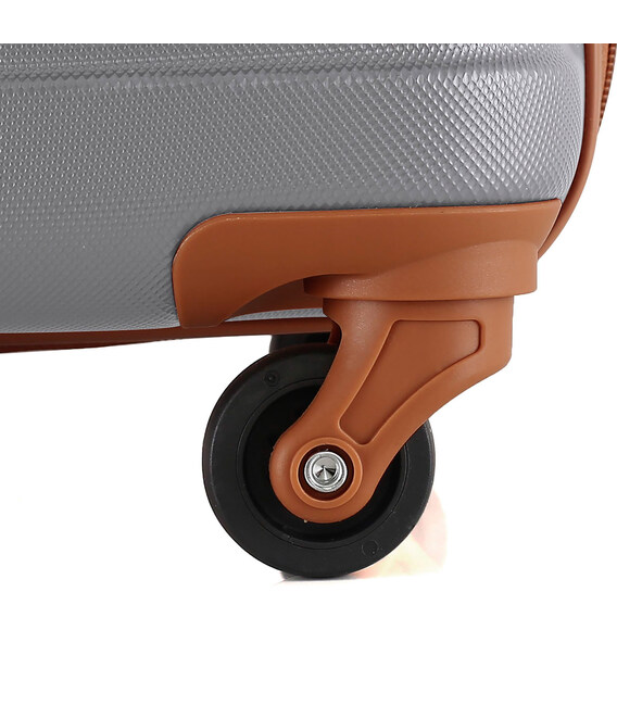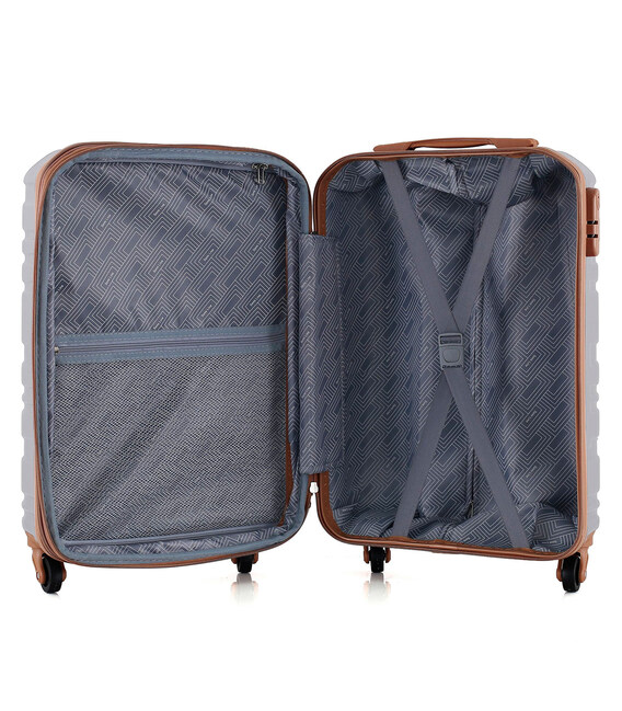 Корпус має рифлене покриття, яке приховує дрібні подряпини, а кодовий замок захищає речі під час переїздів. Валіза оснащена чотирма повноповоротними колесами на 360°, що забезпечують маневреність і стійкість, а також телескопічною сталевою ручкою, яка фіксується у трьох положеннях. Внутрішній простір розділений текстильною перегородкою з кишенею на блискавці для дрібних речей, є еластичні компресійні ремені для фіксації одягу. Верхня ручка має м’яку гелеву підкладку, що додає комфорту при перенесенні.
